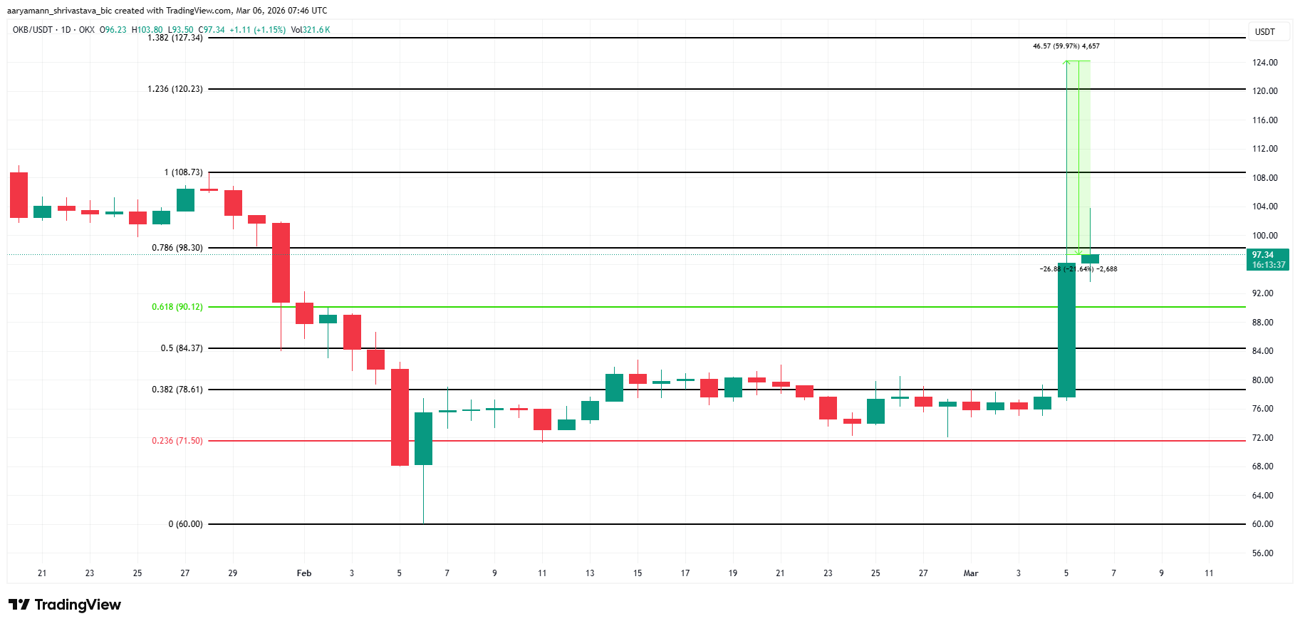 Tällä hetkellä 98,00 dollarin vastustaso hidastaa OKB:n hinnan nousua. Jos raja ei mene rikki, tokenin arvo saattaa laskea 90,00 dollarin tukitasolle, jonka muodostaa 61,8 % Fibonacci-palautuslinja. Tukitason pettäminen voisi johtaa hinnan laskuun 78,00 dollariin, tasolle jolla OKB on aiemmin käynyt.