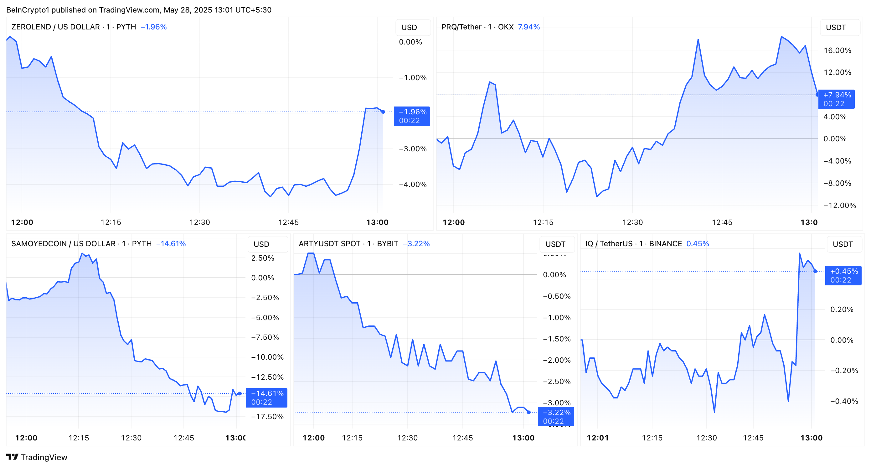 Erityisesti kaikki altcoinit notkahtivat pian ilmoituksen jälkeen, mikä heijastaa sijoittajien huolia vähentyneestä likviditeetistä ja saatavuudesta. SAMO koki jyrkimmän laskun, lähes 15%. Sitä seurasi PRQ, joka koki noin 9% notkahduksen. ZERO ja ARTY molemmat heikkenivät noin 4%. Lopuksi IQ koki vähäisen 0,09% laskun.