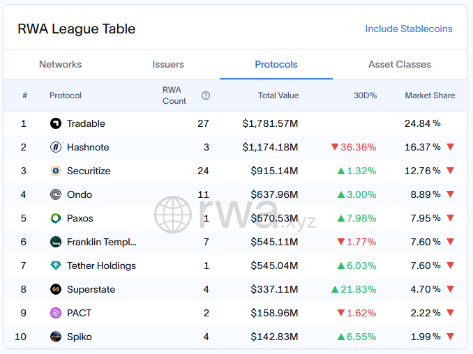 Ondo Financen viimeisin ilmoitus vahvistaa yrityksen aseman johtajana RWA-tokenisoinnin alalla. Ondo on neljänneksi suurin protokolla (pois lukien stablecoinit) RWA:n kokonaisarvossa, yli 637 miljoonan dollarin omaisuuserillä. Koko RWA-sektori kukoistaa, ylittäen 17 miljardin dollarin kokonaisarvon.