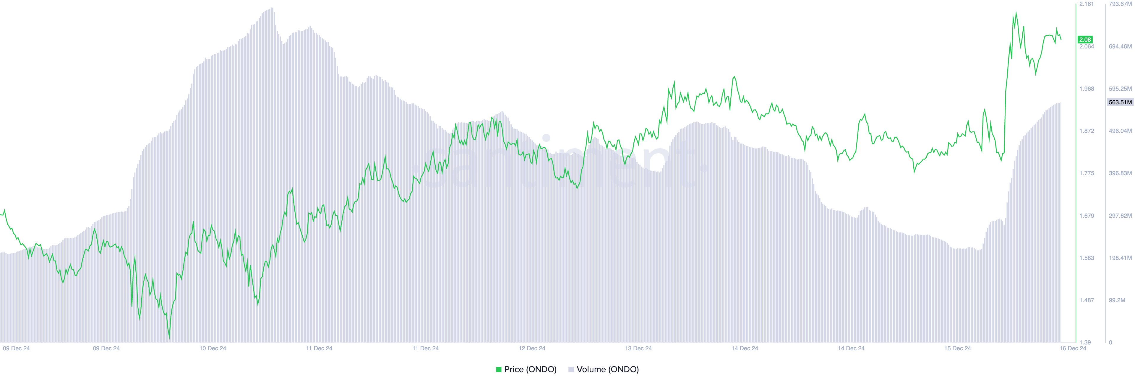 Vaikka se vetäytyi, ONDO on silti noussut 17 % viimeisen 24 tunnin aikana ja on markkinoiden suurin nousija. Hinnannousu on tapahtunut samanaikaisesti ONDO:n päivittäisen kaupankäyntivolyymin kasvun kanssa, joka on noussut yli 120 % tarkastelujakson aikana.