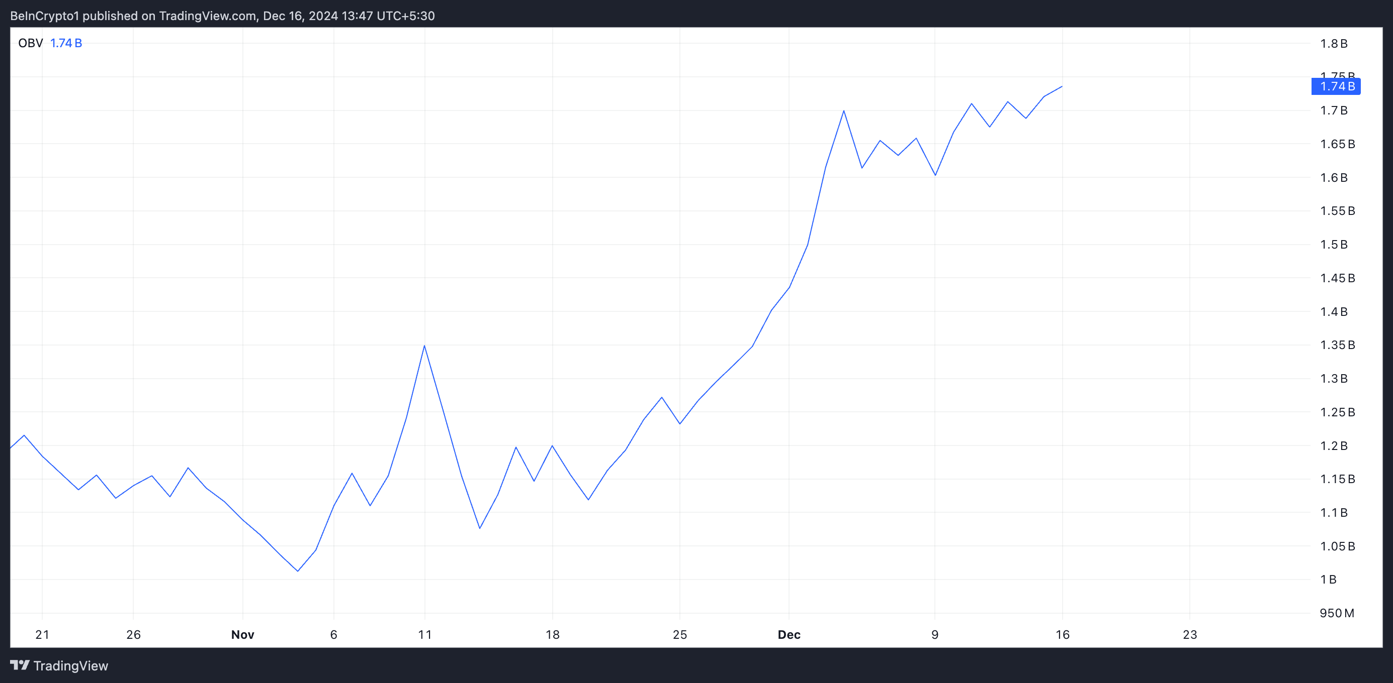 OBV-indikaattori seuraa omaisuusvaran kumulatiivista volyymia. Se lisää volyymia nousupäivinä ja vähentää sitä laskupäivinä mitatakseen osto- ja myyntipainetta. Kun OBV nousee hintarallin aikana, se osoittaa, että hinnannousu on vahvan ostokiinnostuksen tukema, mikä viittaa siihen, että nousutrendi voi olla kestävä.