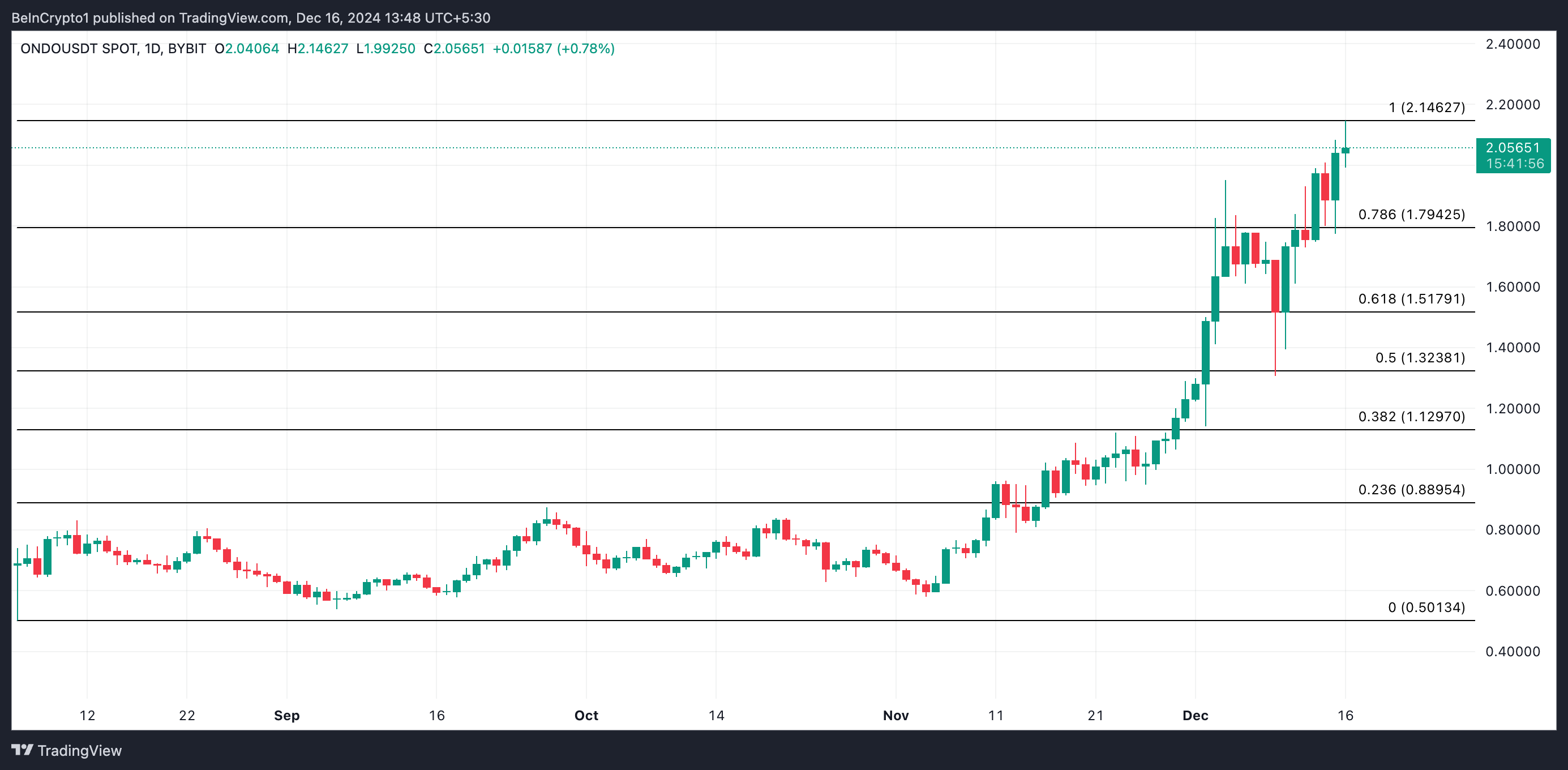Päivittäisessä kaaviossa ONDO käy kauppaa 2,05 dollarilla, hieman alle kaikkien aikojen korkeimman arvonsa 2,14 dollaria, joka on muodostanut vastustason. Onnistunut läpimurto tämän vastustason yläpuolella nostaa ONDO:n hinnan uusiin huippuihin.