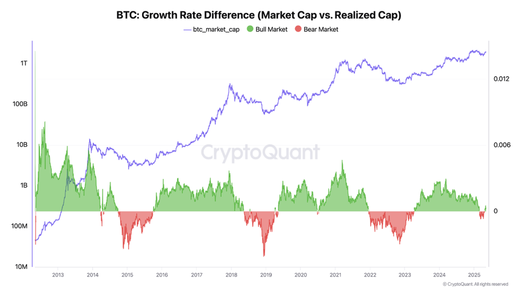 Analyytikko Darkfost tarjosi varovaisemman näkökulman tarkastellessaan Growth Rate Indicatoria. Tämä indikaattori arvioi Bitcoin-markkinoiden tilaa — härkä tai karhu — vertaamalla Bitcoinin markkina-arvoa ja realisoitua arvoa.