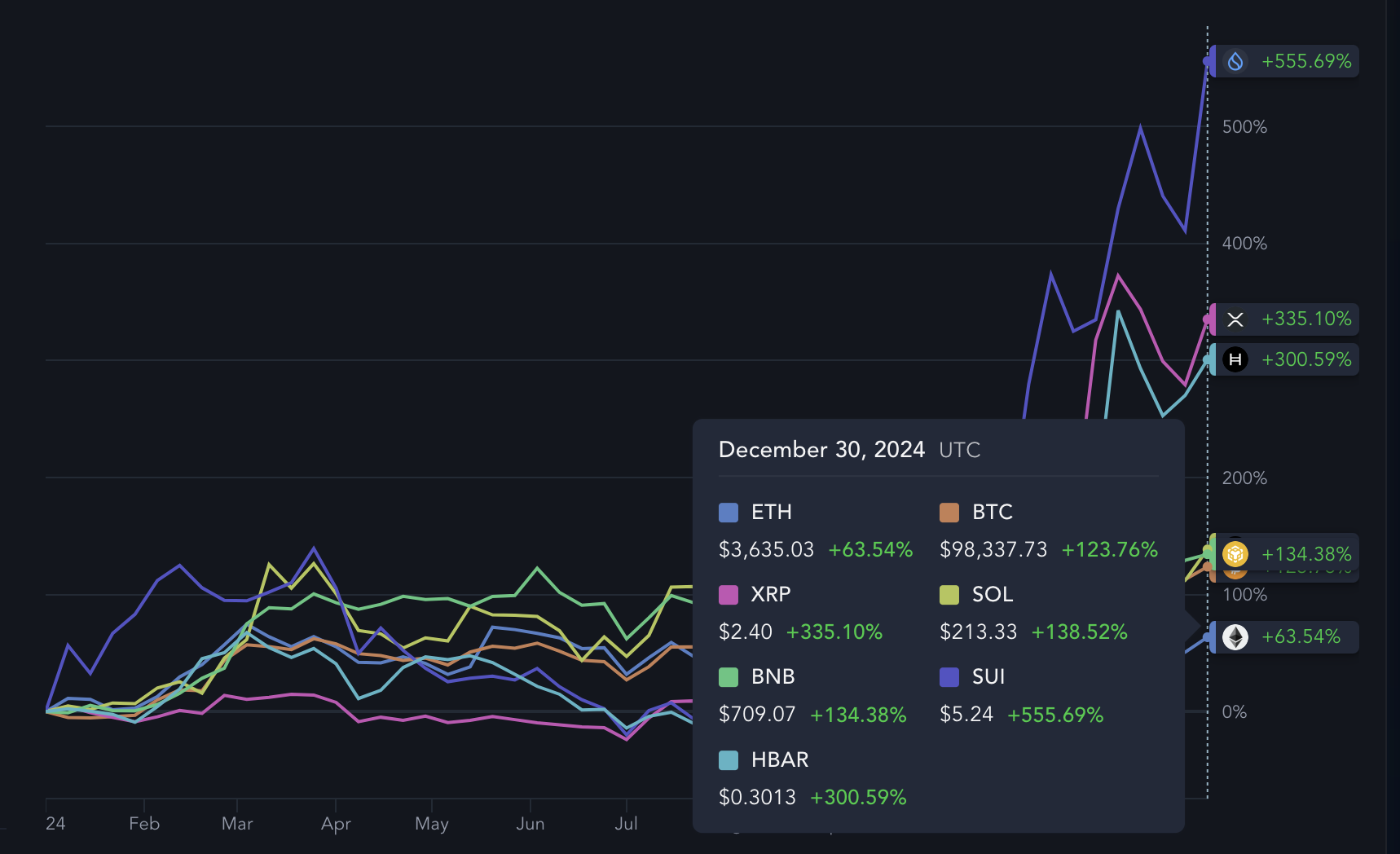 Pienemmät toimijat kuten Hedera (300 %), XRP (335 %) ja SUI (555 %) ylittivät merkittävästi, mikä viittaa siihen, että pääoma virtasi vaihtoehtoisiin ekosysteemeihin, joissa oli korkeammat tuotot.