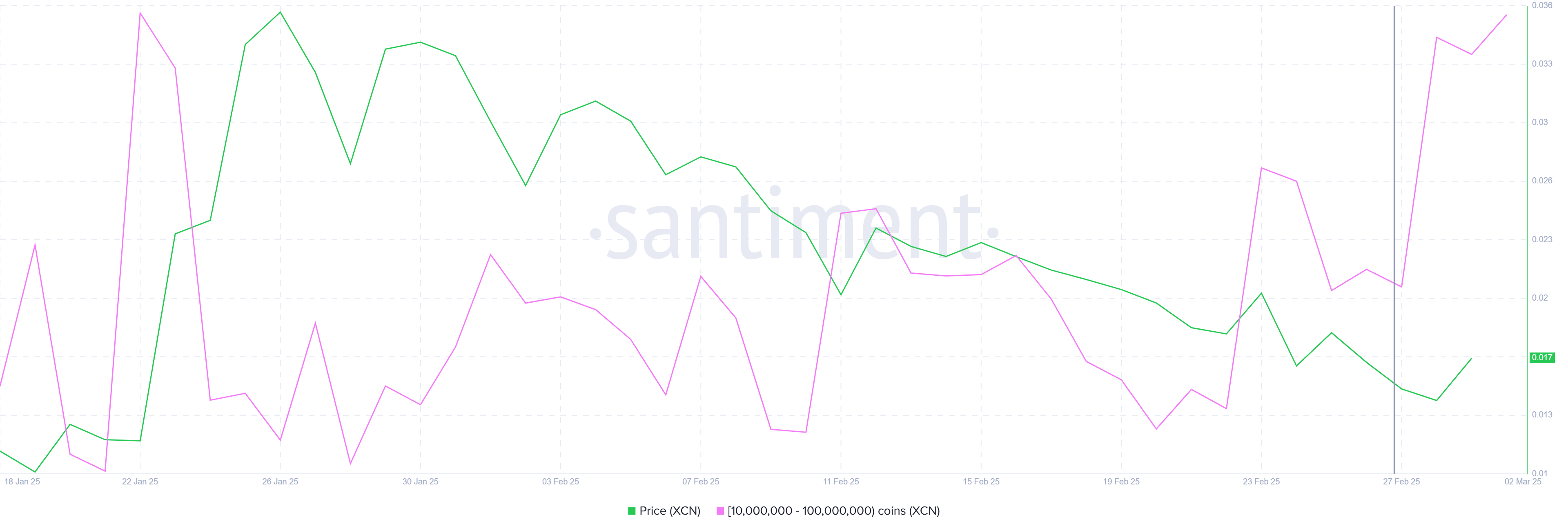 Valas-sijoittajat, joilla on 10 miljoonasta 100 miljoonaan XCN:ää, ovat aktiivisesti keränneet tokenia. Viimeisten kolmen päivän aikana nämä sijoittajat ovat ostaneet yli 368 miljoonaa XCN:ää, arvoltaan 5,6 miljoonaa dollaria. Tämä osoittaa, että valas-sijoittajat luottavat Onyxcoinin hinnan palautumiseen ja keräävät sitä alemmilla hinnoilla hyötyäkseen tulevista voitoista.