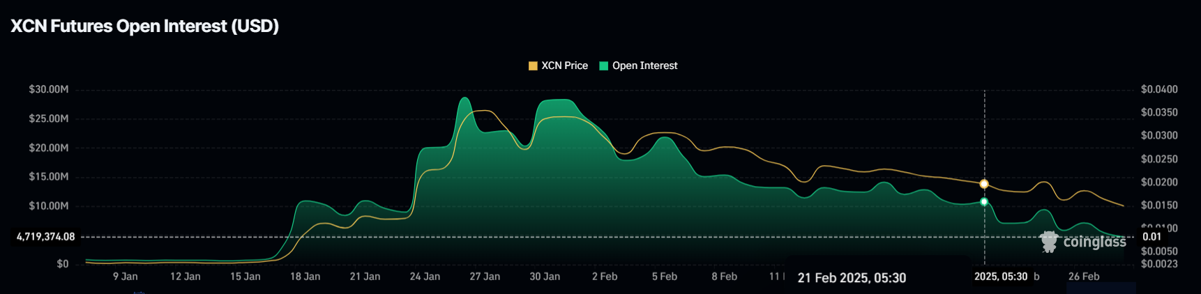 Onyxcoinin open interest on kokenut dramaattisen laskun, pudoten yli 50 % vain viikossa. Se laski 10,8 miljoonasta dollarista 4,7 miljoonaan dollariin, mikä heijastaa kauppiaiden vetäytymistä altcoinin elpymisen puutteen vuoksi. Tämä open interestin lasku viittaa karhumaiseen näkymään ja pelkoon omaisuusvaran kasvun puutteen vuoksi.