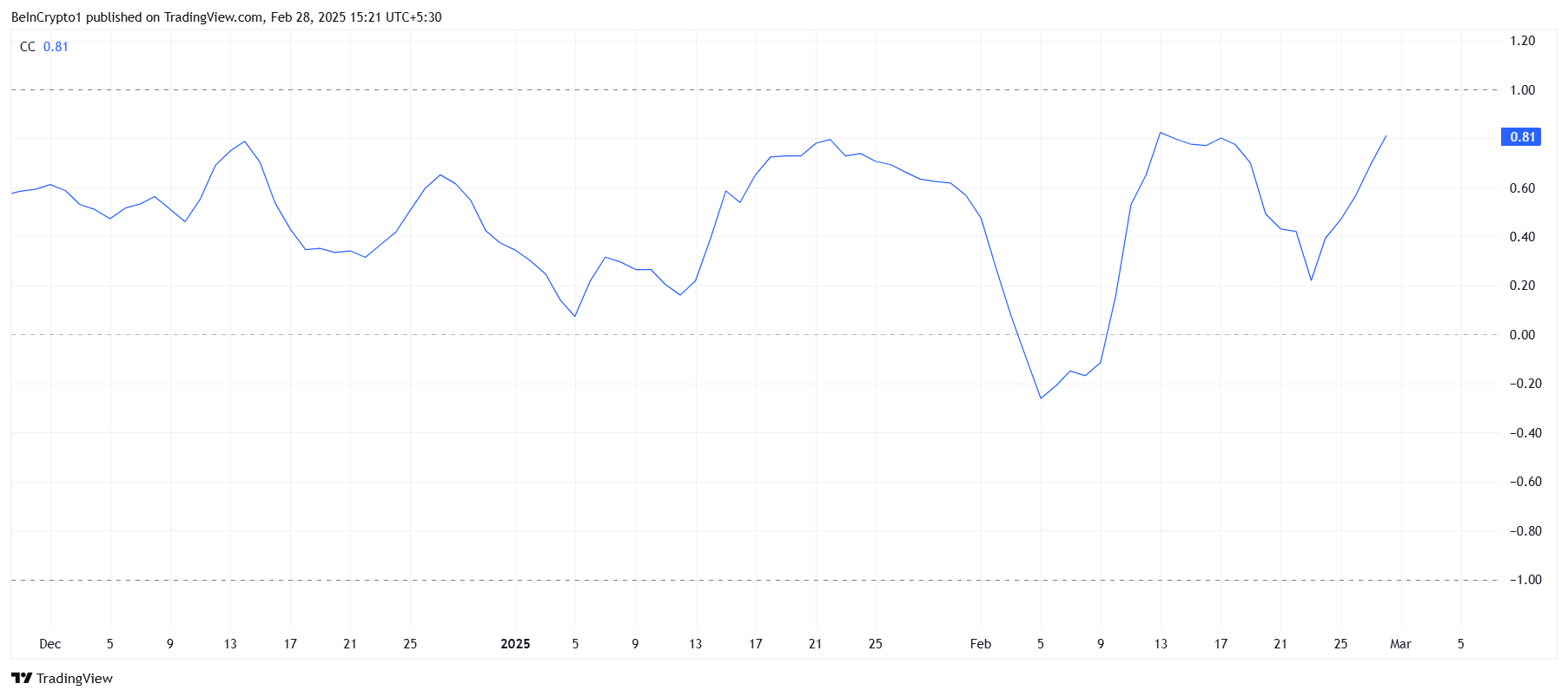 Onyxcoinilla on vahva korrelaatio Bitcoiniin, joka on tällä hetkellä 0,81. Tämä korkea korrelaatio tarkoittaa, että XCN on seurannut läheisesti Bitcoinin markkinaliikkeitä. Koska Bitcoin on äskettäin pudonnut alle 80 000 dollarin, Bitcoinin karhumainen trendi on vaikuttanut Onyxcoiniin, vetäen sen hintaa alaspäin.