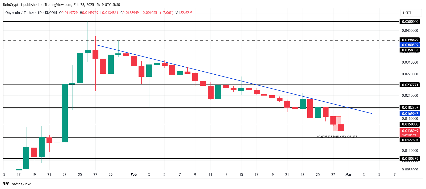 Onyxcoin (XCN) on kokenut merkittävän hinnanlaskun viimeisen kuukauden aikana, pudoten 0,035 dollarista 0,013 dollariin tänään. Tämä jatkuva laskusuunta heijastaa Bitcoinin hintakehitystä, sillä altcoin näyttää seuraavan laajemman markkinan karhumaista tunnelmaa.