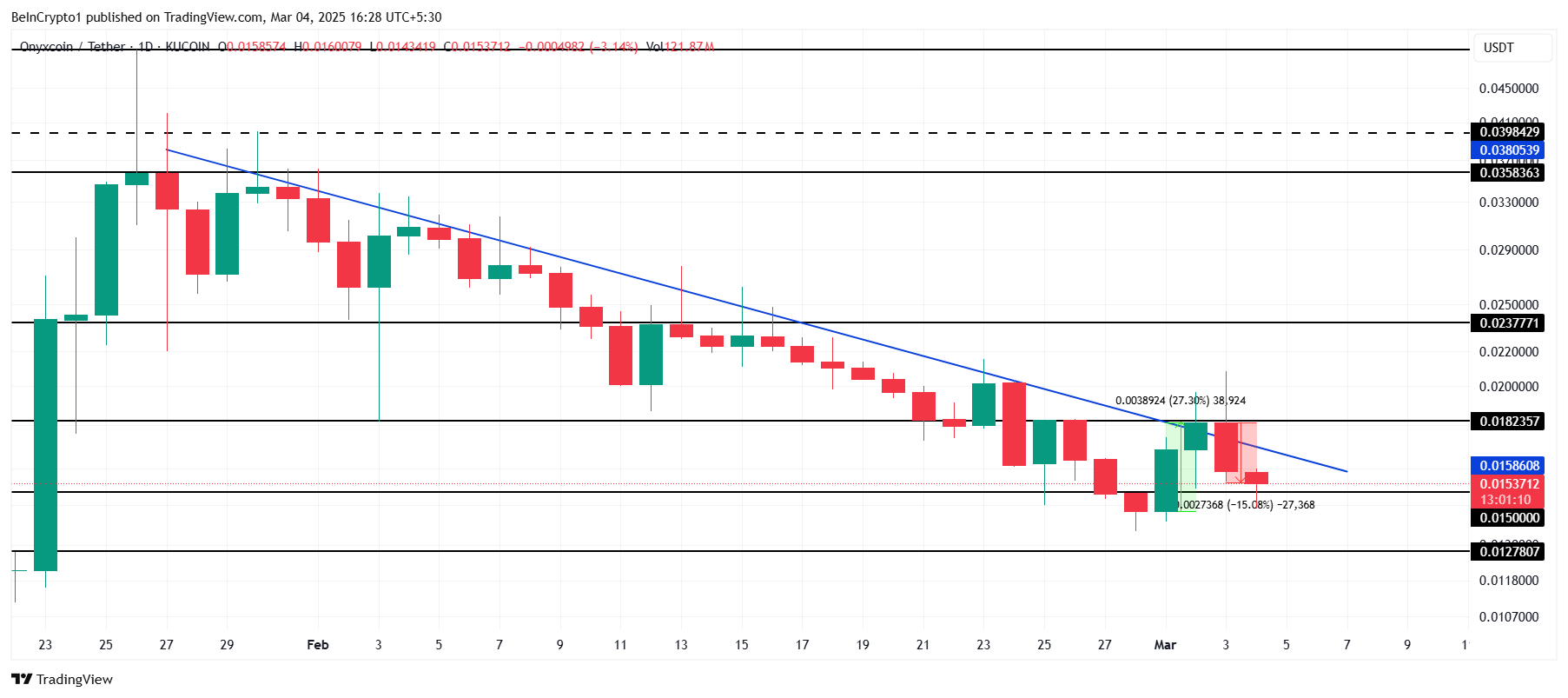 Onyxcoinin hinta on pudonnut 15 % viimeisen 24 tunnin aikana, jatkaen neljä viikkoa kestänyttä laskutrendiään. Lyhyen 27 %:n hintarallin jälkeen viikonloppuna altcoin ei onnistunut ylläpitämään noususuuntausta, ja aiempi breakout-yritys mitätöitiin. XCN on tällä hetkellä jumissa alle 0,0182 dollarin keskeisen vastustason, ja sen tuki on 0,0150 dollarissa.