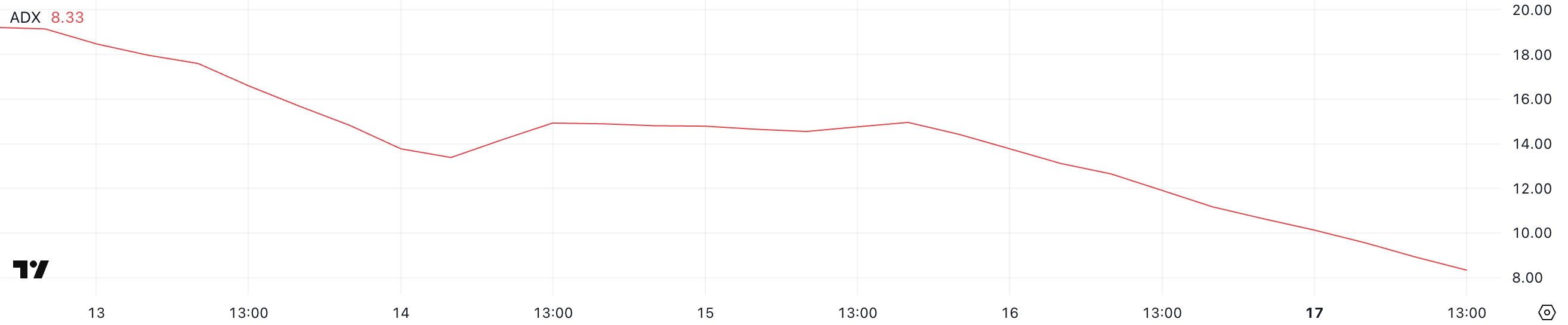Onyxcoinin ADX on tällä hetkellä 8,33, laskenut 14,7:stä vain kaksi päivää sitten.