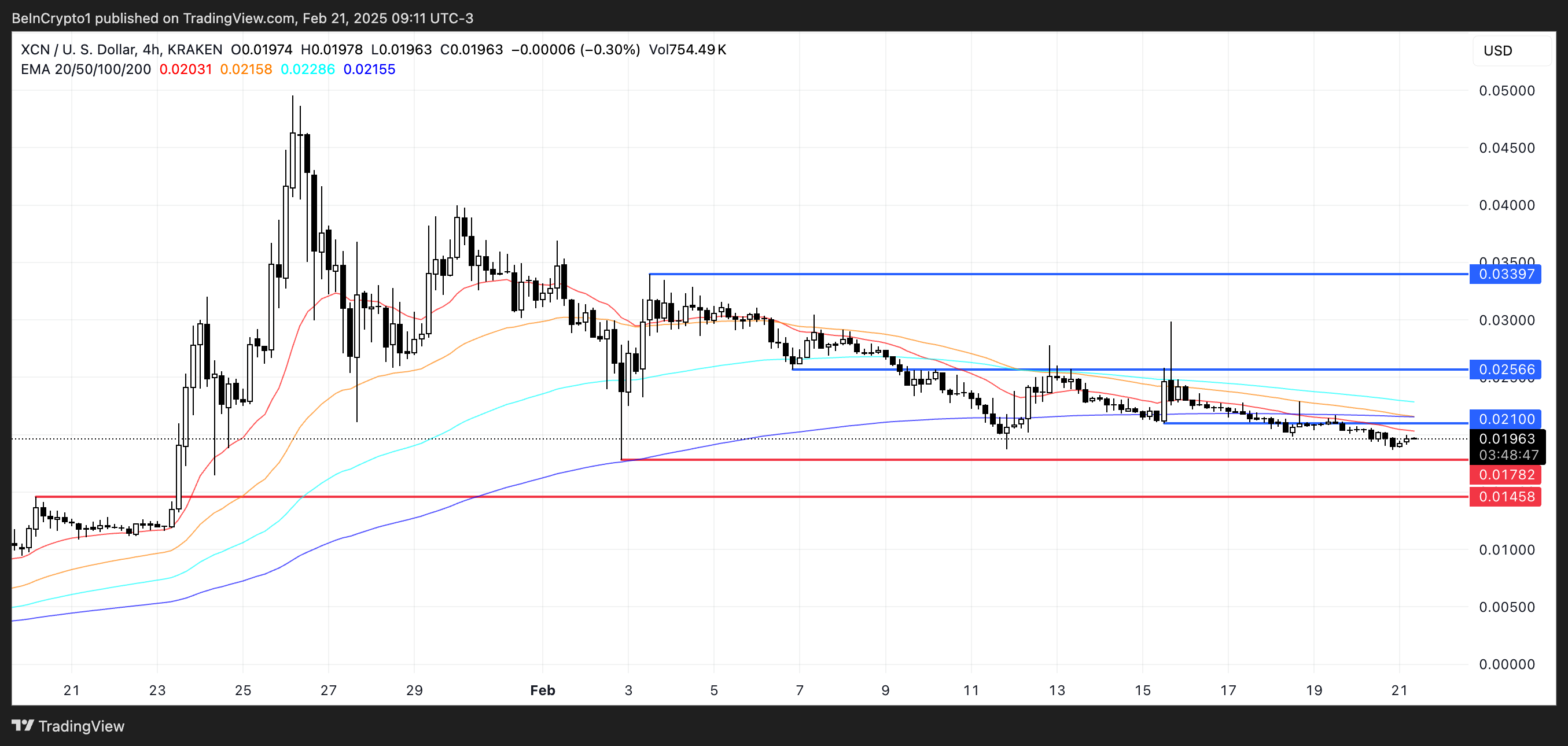 Tämä viittaa siihen, että myyntipaine on hieman helpottanut, vaikka karhut pitävät yhä hallintaa. Jos myyntipaine jatkuu, XCN voi testata tukitasoa 0,017 dollarissa.