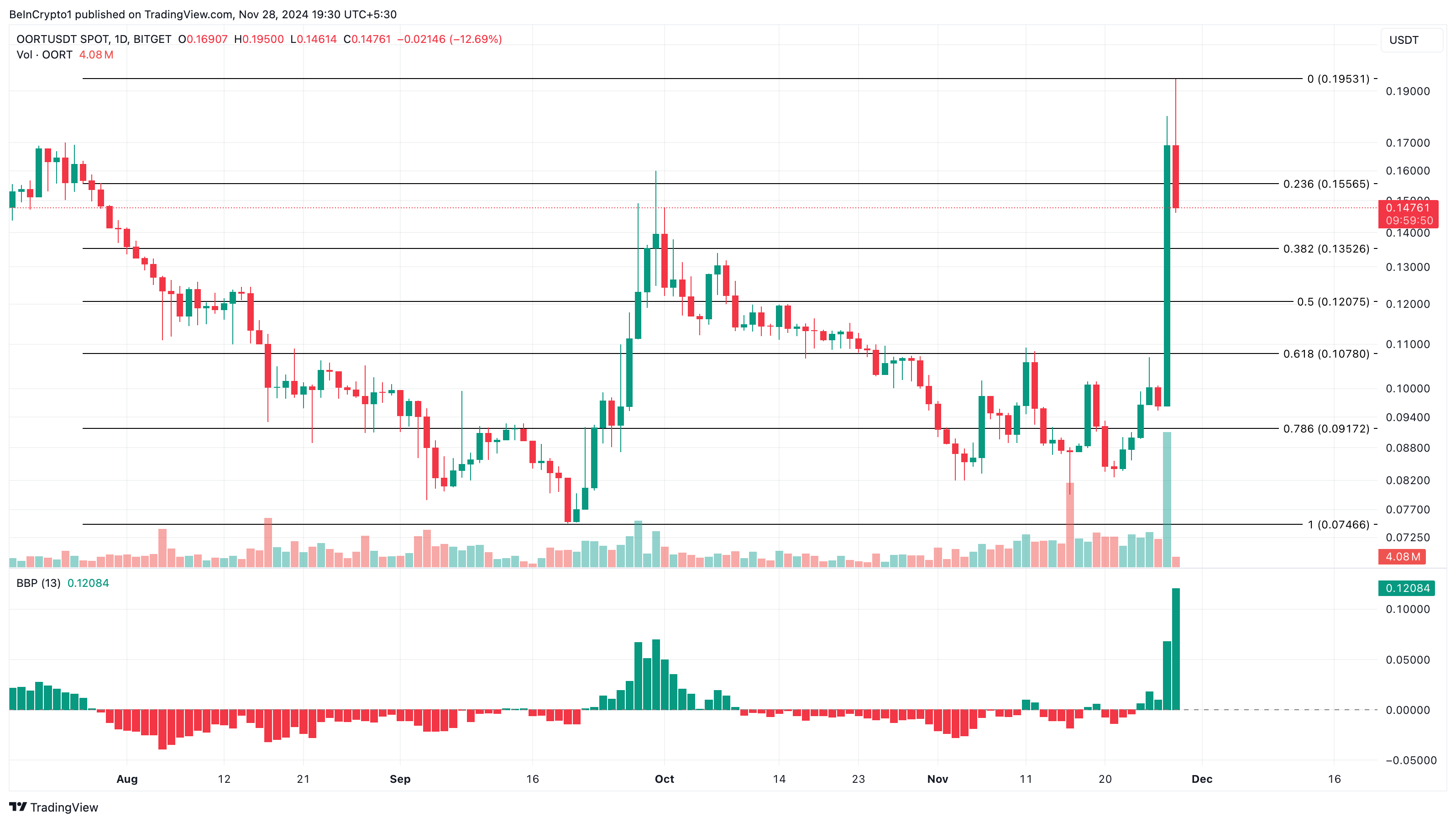 Päivittäinen OORT/USD-kaavio paljastaa, että Bull Bear Power (BBP) on siirtynyt positiiviselle alueelle, mikä osoittaa, että ostajat (härät) ovat tällä hetkellä vahvemmilla kuin myyjät (karhut).