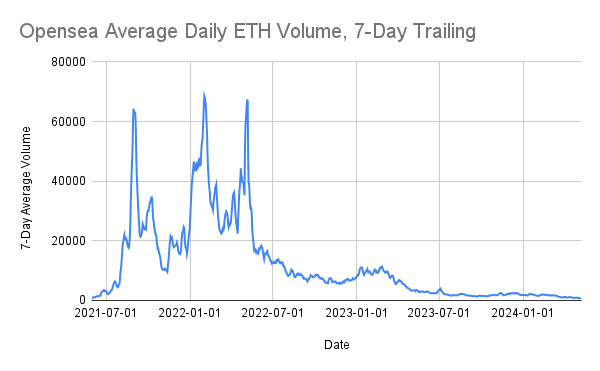 OpenSea, non-fungible token (NFT) -markkinapaikka, kohtaa merkittävän haasteen päivittäisellä kaupankäyntivolyymillaan ETH NFT:issä.