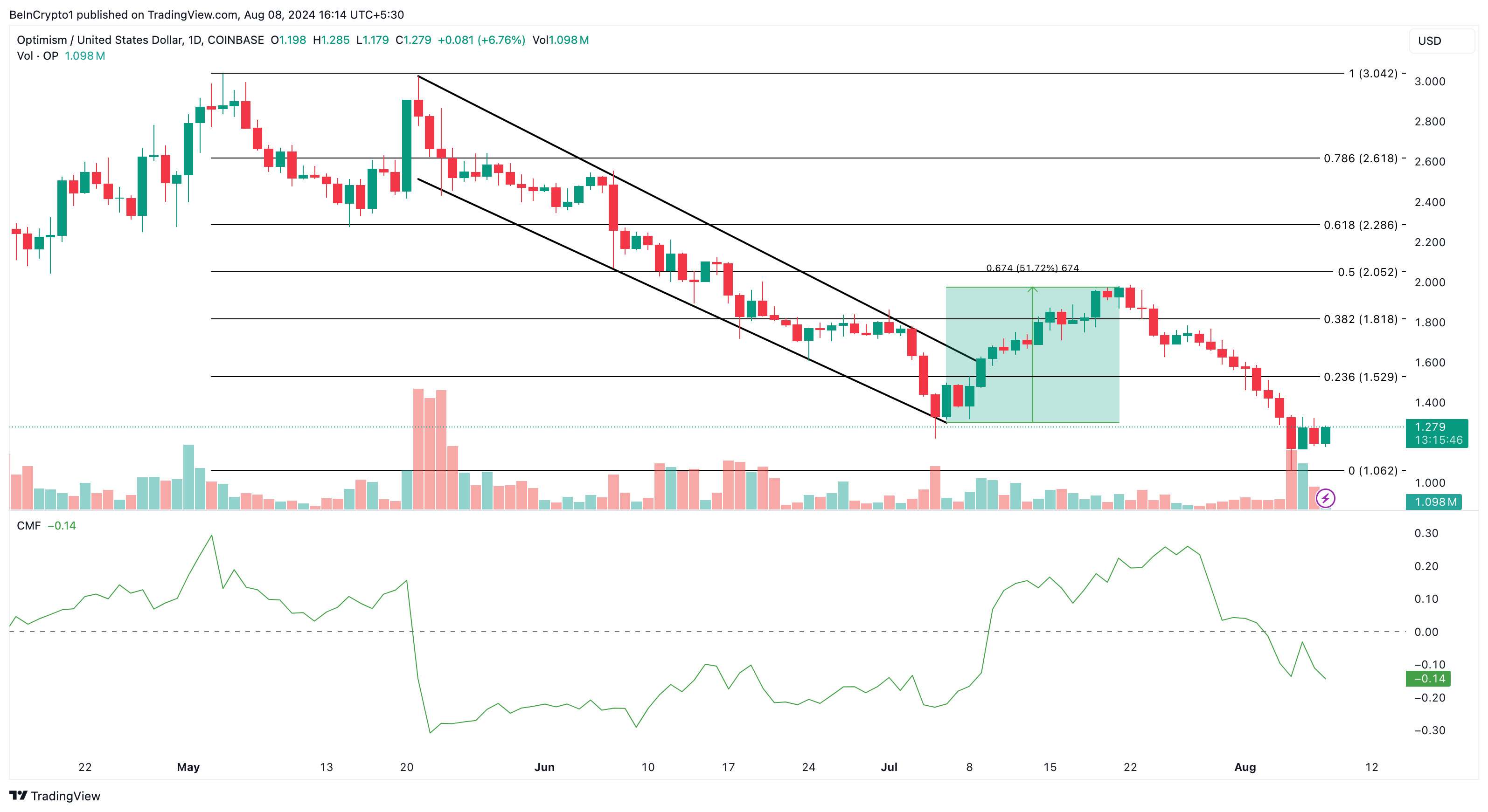 Positiivinen CMF-lukema osoittaa, että kertyminen ylittää jakautumisen. Lasku OP/USD-kaaviossa viittaa lisääntyneeseen jakautumiseen. Jos trendi jatkuu, OP:n hinta voi laskea 1,06 dollariin.