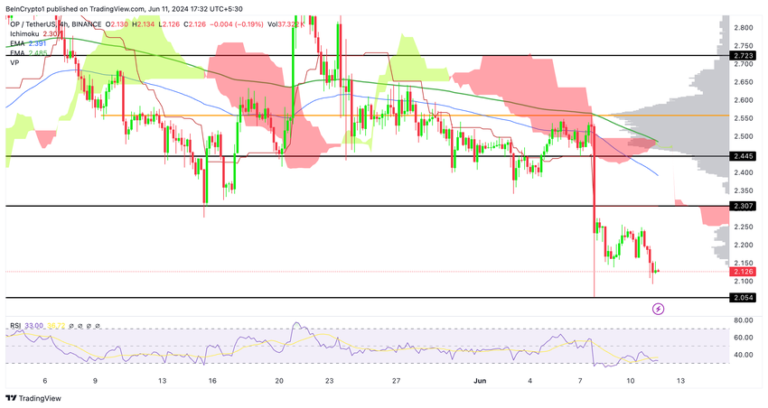 Tutkiessamme Optimism-tokenin 4 tunnin kaaviota näemme, että 7. kesäkuuta hinta murtautui Ichimoku-pilven alapuolelle, mikä johti 18 %:n pudotukseen kyseisessä puhkeamiskynttilässä.
