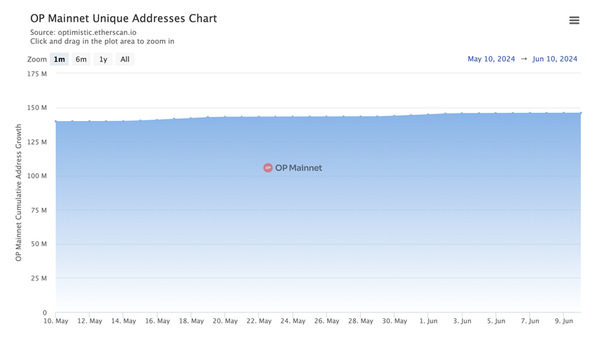 1. toukokuuta 2024 ja 10. kesäkuuta 2024 välisenä aikana yksilöllisten osoitteiden määrä OP Mainnetissä kasvoi 138 107 252:sta 145 937 135:een, mikä merkitsee yhteensä 7 829 883 osoitteen lisäystä.