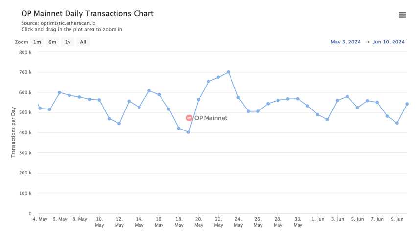 Kesäkuun 1. ja kesäkuun 10. päivän välisenä aikana OP Mainnetin tapahtumamäärä kasvoi 53 778 tapahtumalla (487 984:stä 541 762:een). Tämä merkitsee huomattavaa parannusta päivittäisessä toiminnassa, mikä heijastaa käyttäjien lisääntynyttä sitoutumista tai merkittäviä verkkotapahtumia, jotka lisäävät tapahtumamääriä.