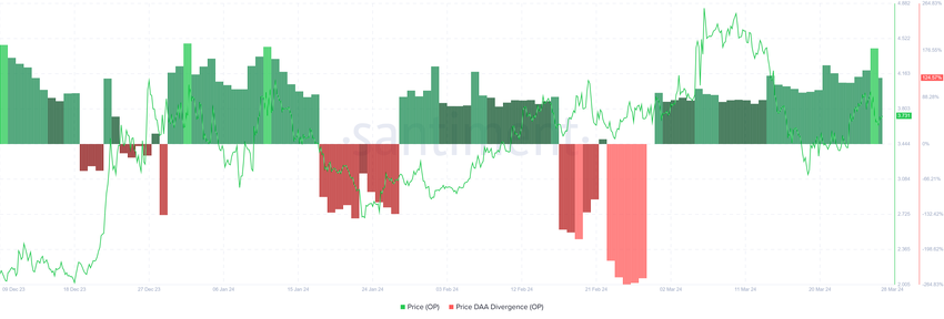 Yhdessä sijoittajien lisääntyneen aktiivisuuden kanssa verkostossa ja hinnan laskun kanssa Optimismilla on nähtävissä ostosignaali. Hinnan päivittäisten aktiivisten osoitteiden (DAA) poikkeaman mukaan OP on tällä hetkellä hyvä omaisuuserä kerättäväksi.