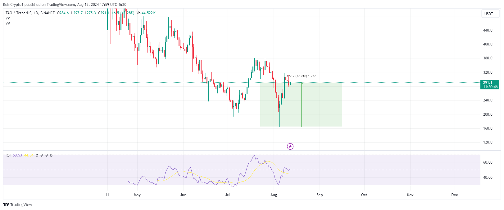 Samaan aikaan TAO on eturintamassa tekoälyn (AI) sektorilla, joka on muuttanut markkinatunnelman karhumaisesta härkämäiseksi. Tämä muutos liittyy kasvavaan maailmanlaajuiseen kysyntään tekoälyteknologioille. Suhteellisen vahvuusindeksin (RSI) mukaan härät pysyvät hallinnassa, sillä RSI pysyy yli 50:n keskipisteen.
