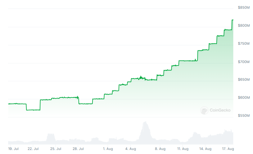 CoinGeckon mukaan PYUSD:n tarjonta on kasvanut yli 300 miljoonalla dollarilla eli 45 prosentilla viime kuukauden aikana. Tämä tekee siitä nopeimmin kasvavan stablecoinin vertaisryhmässään, nykyisen tarjonnan ollessa lähellä 820 miljoonaa dollaria.