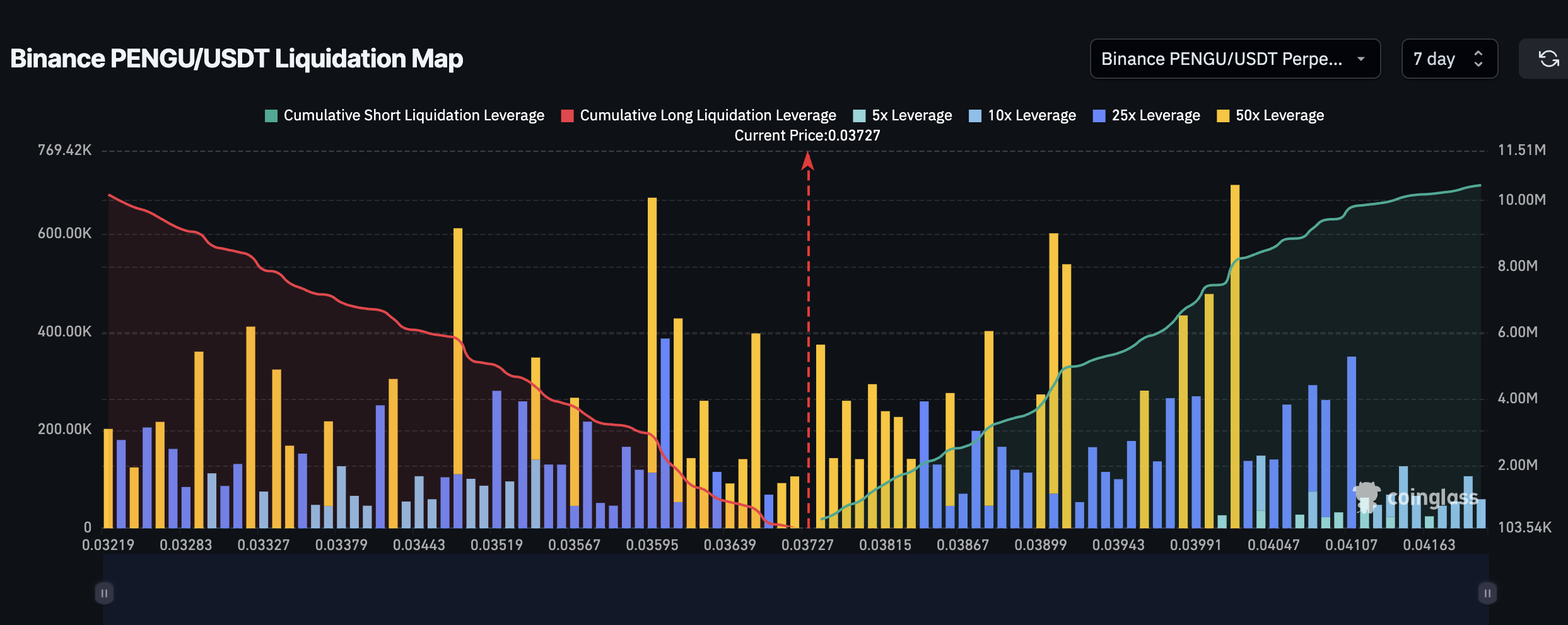 Likvidointikartta näyttää lyhyiden positioiden kertymisen; jos PENGU:n hinta nousee nopeasti, ne, jotka lyövät vetoa sitä vastaan, saattavat joutua ostamaan takaisin, mikä nostaa hintaa entisestään.