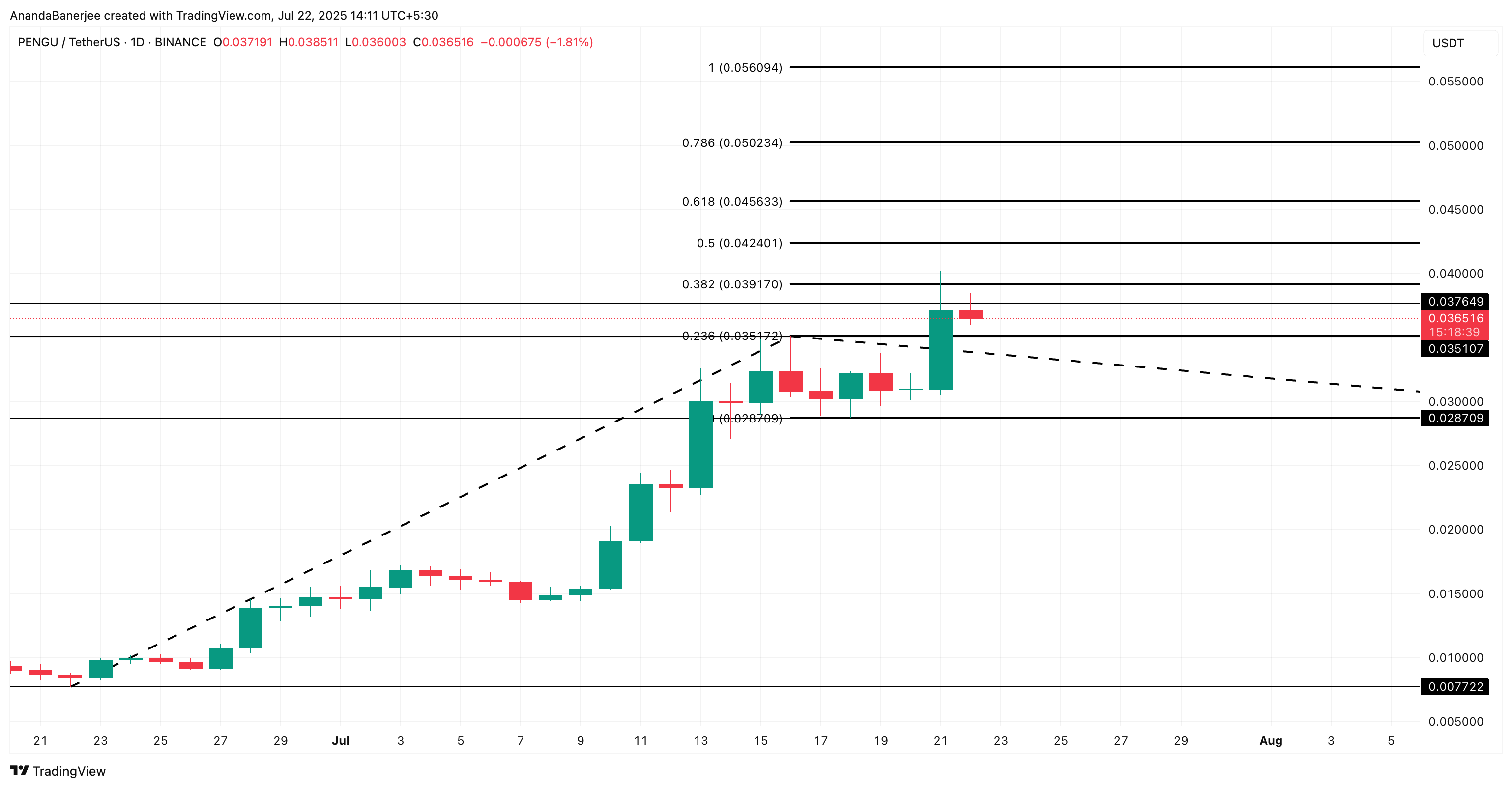 Teknisesti PENGU-hinta on testannut 0,382 Fibonacci-tasoa lähellä 0,039 dollaria kahdesti ja epäonnistunut murtamaan sen yläpuolelle puhtaasti. Se käy nyt kauppaa juuri tämän vastustason alapuolella. Huomaa, että Fib-laajennusvastuksen lisäksi on myös keskeinen vastustaso 0,037 dollaria.