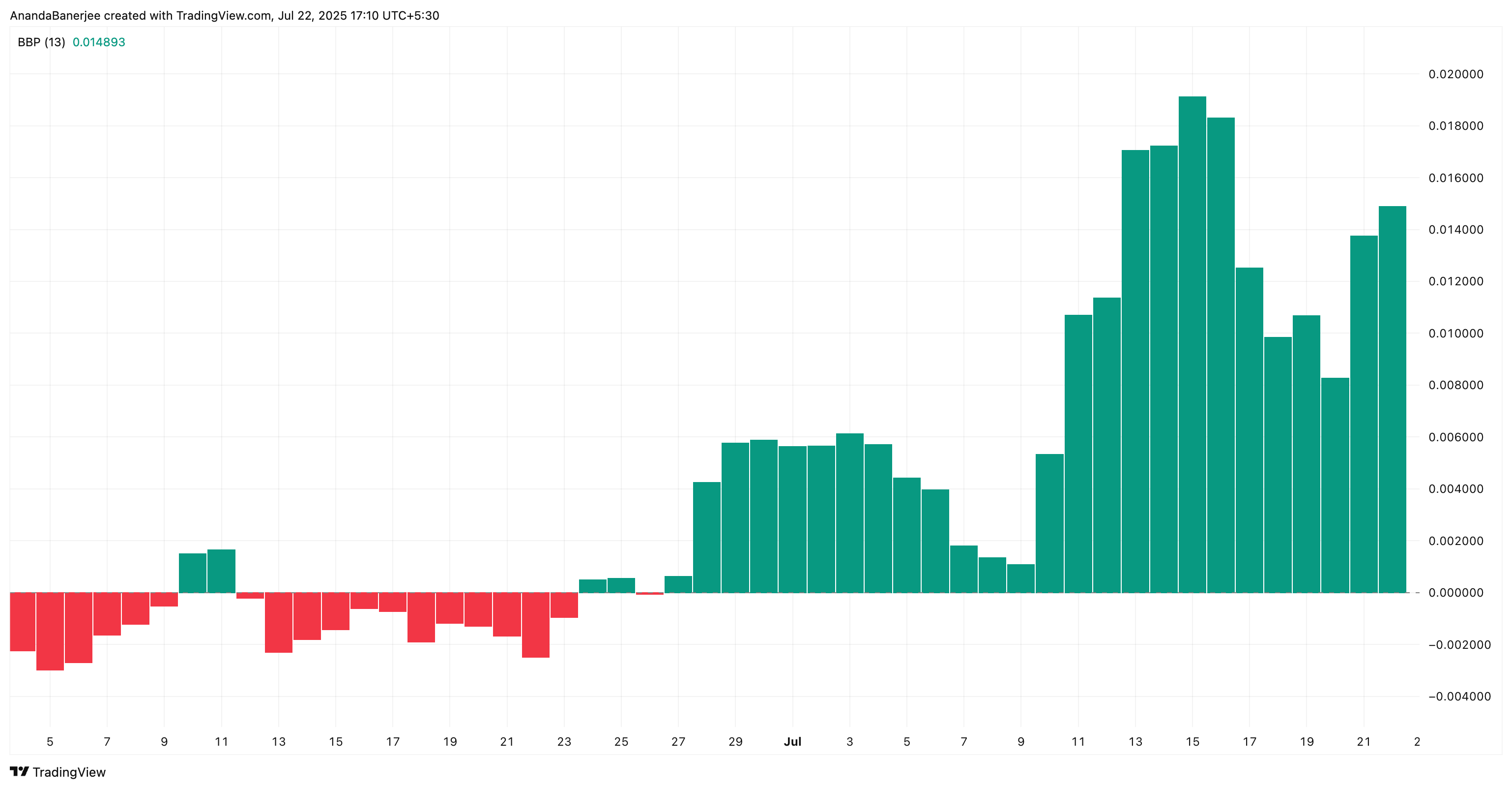 Yksinkertaisesti sanottuna, kun BBP on positiivinen, härät ovat vahvempia kuin karhut. Ja Pengun BBP on pysynyt yli nollan kesäkuun lopusta lähtien, vaikka hinnat ovat pysyneet alle keskeisen vastustason. Tämä vakaa vahvuus voi olla merkki siitä, että mikä tahansa notkahdus on vain osa jäähtymistä ennen uutta nousua.