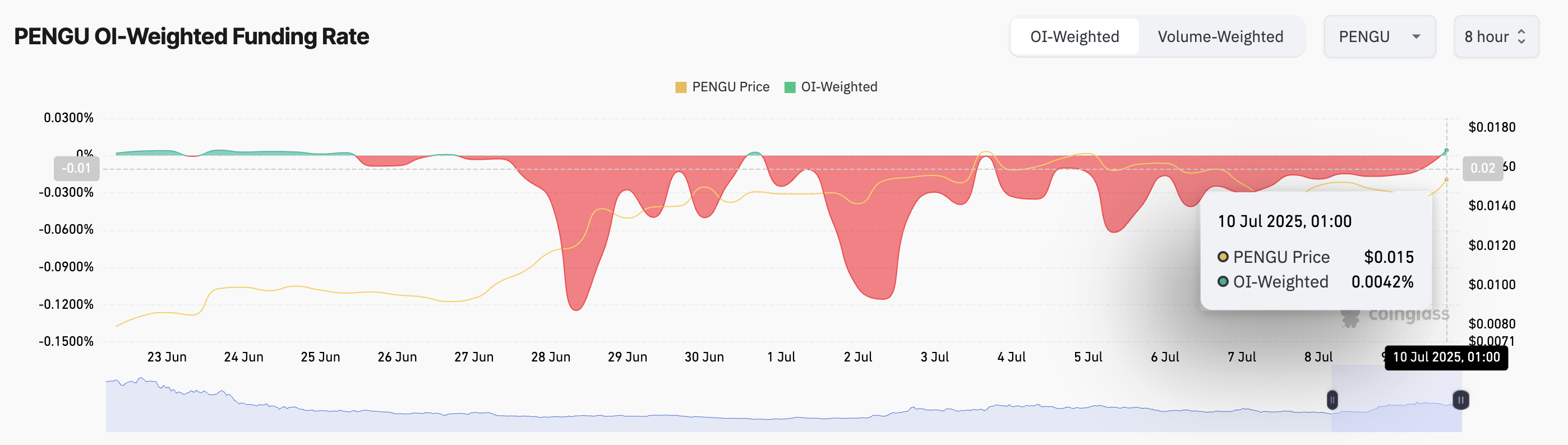PENGU:n rahoitusaste on kääntynyt positiiviseksi ensimmäistä kertaa heinäkuun alusta lähtien, mikä viittaa siihen, että kauppiaat tekevät yhä enemmän pitkiä vetoja. Tätä kirjoitettaessa se on 0,0042%.