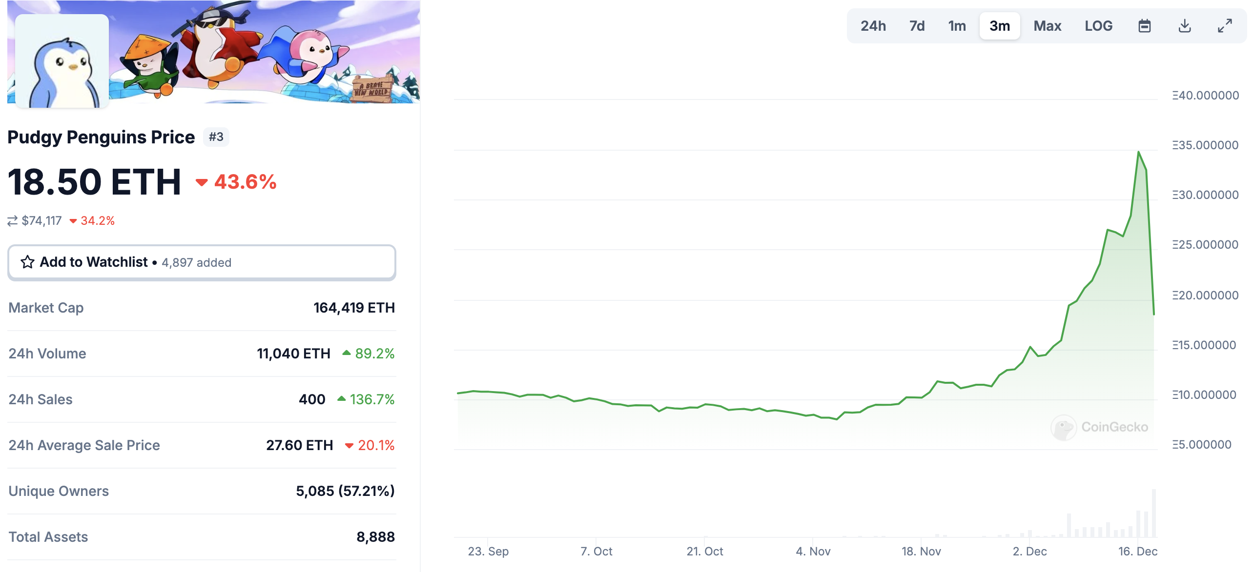 Ennen tämän päivän PENGU-airdroppia ja tokenin julkaisua Pudgy Penguinsin NFT-lattiahinta saavutti kaikkien aikojen korkeimman arvon 34,80 ETH, mikä on yli 100 000 dollaria.