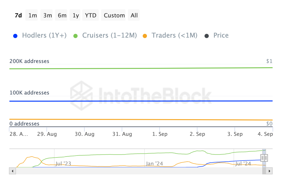 Lisäksi Osoitteet ajan mukaan -tunnusluku vahvistaa tätä tunnelmaa. IntoTheBlockin tiedon perusteella osoitteiden määrä, jotka ovat pitäneet tokenia viimeisen 30 päivän aikana, on laskenut 20 %.