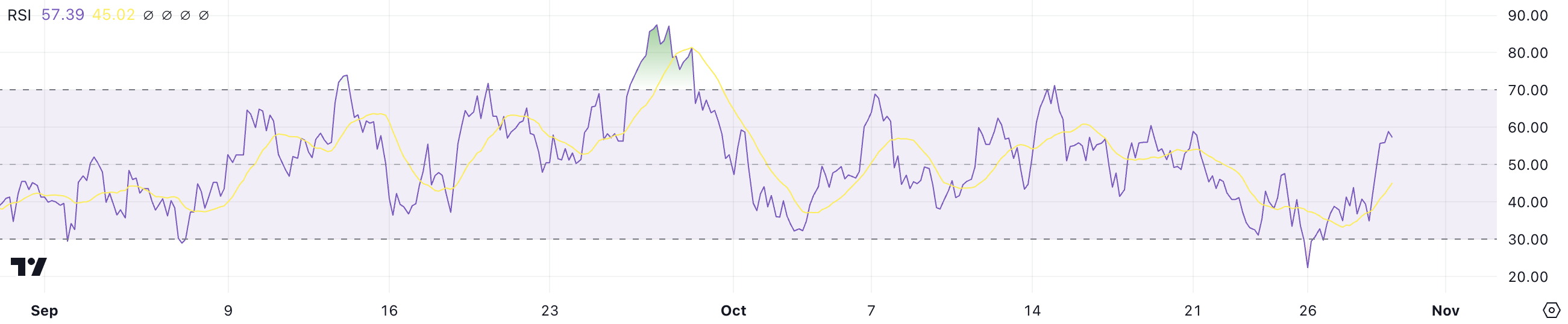 RSI mittaa hintaliikkeiden nopeutta ja suuruutta. Se vaihtelee 0:sta 100:aan, arvot alle 30 osoittavat ylialimyytyä tilaa ja yli 70 yliostettua. PEPEn RSI on 57,39, mikä on vielä mukavasti yliostetun kynnyksen alapuolella.