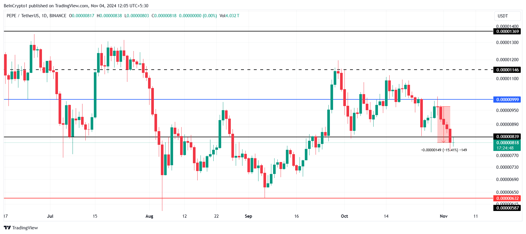 PEPE-hinnan on viime aikoina ollut paineita, ja se on kamppaillut pysyäkseen 0,00001000 dollarin tasolla, joka oli aiemmin kriittinen tukitaso. Epäonnistuminen on voimistanut karhumaista tunnelmaa meemikolikon ympärillä, jättäen sen alttiiksi lisätappioille.