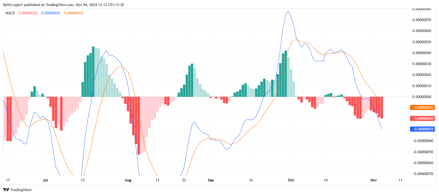 PEPE:n makrotason liikehdintä heijastaa vahvoja karhumaisia sävyjä, kuten Liukuvien Keskiarvojen Konvergenssi/Divergenssi (MACD) -indikaattori osoittaa. MACD näyttää alaspäin suuntautuvan käyrän, korostaen kasvavaa karhumaista trendiä PEPE:lle. Kun MACD-viivat osoittavat alaspäin, se tyypillisesti merkitsee jatkuvaa myyntipainetta, ja PEPE:n tapauksessa tämä suuntaus on ollut jatkuvaa. Tämä viittaa siihen, että meemikolikon laskutrendi saattaa jatkua, ellei käänteisen signaalin ilmaannu.