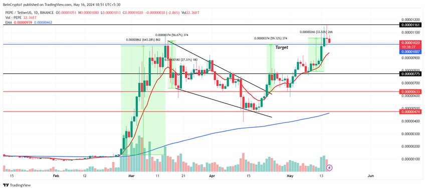 PEPE:n hinta rikkoi 0,00001007 dollarin keskeisen vastuksen, minkä ansiosta meemikolikko saavutti uuden kaikkien aikojen ennätyksen. Tämä on kuitenkin myös asettanut meemikolikoiden harrastajat myyntiin. Tämä johtuu siitä, että sijoittajat näkevät tällä hetkellä vankkoja voittoja.