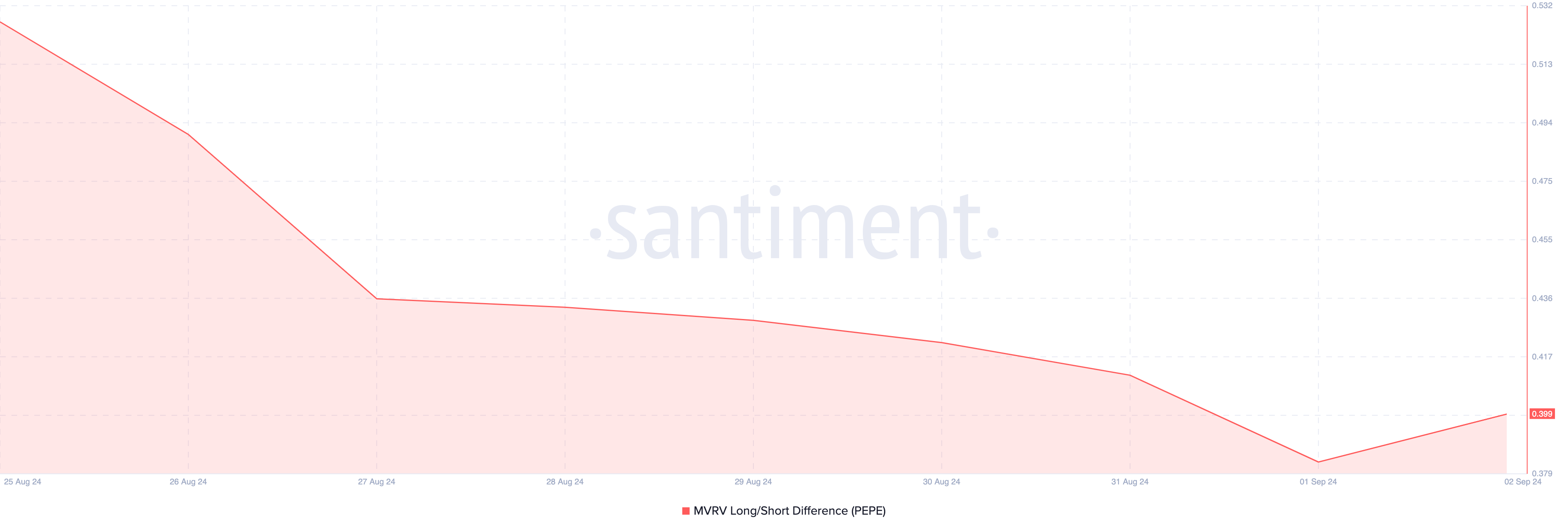 Santimentin ketjuanalyysin mukaan Market Value to Realized Value (MVRV) Long/Short Difference laski 55 %:sta 36 %:iin elokuun 24. ja 31. päivän välillä. Tämän tunnusluvun laskeminen viittaa siihen, että lyhytaikaiset haltijat tajuavat enemmän voittoja kuin pitkäaikaiset haltijat, jos he myyvät nykyisellä hinnalla.