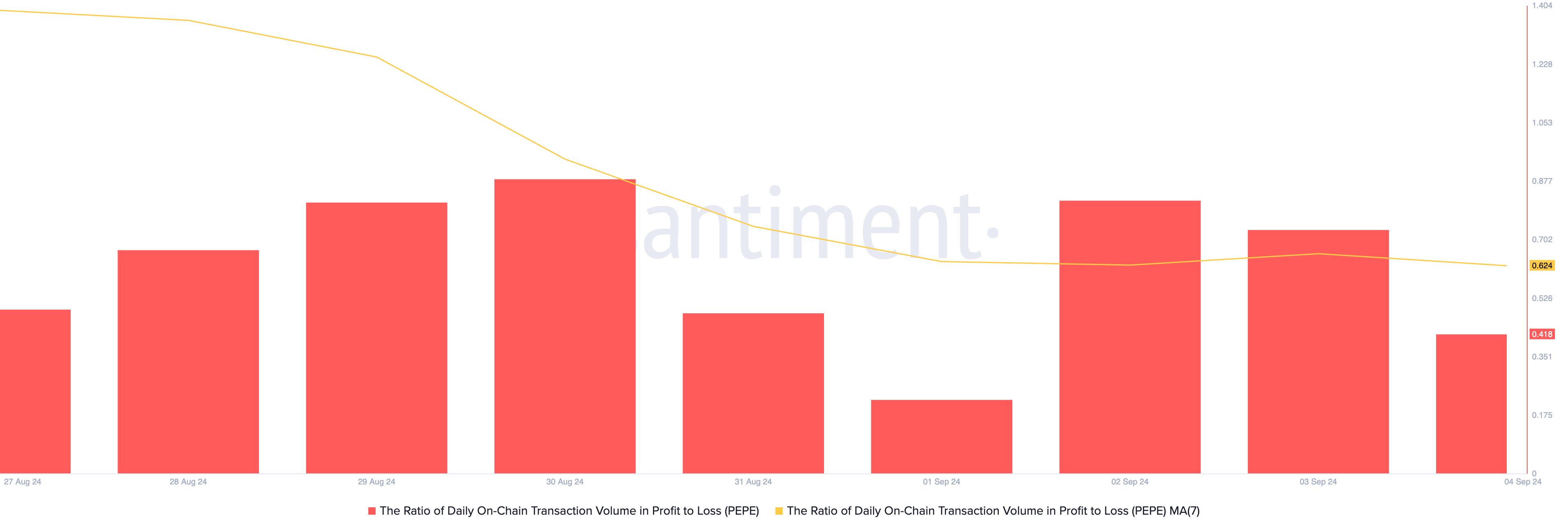 BeInCrypto on havainnut, että Pepen päivittäisen transaktiovolyymisuhteen voitto-tappio, perustuen 7 päivän liukuvaan keskiarvoon, on pysynyt alle yhden elokuun 29. päivästä lähtien. Tällä hetkellä suhde on 0,62, mikä tarkoittaa, että jokaista tappiollista transaktiota kohden on vain 0,62 voitollista transaktiota.