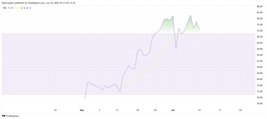 Tämän mahdollisuudet ovat kuitenkin synkät, koska meemikolikko on jo yliostettu, kuten suhteellisesta voimaindeksistä (RSI) nähdään. RSI on vauhtioskillaattori, joka mittaa hintaliikkeiden nopeutta ja muutosta. Se vaihtelee välillä 0-100, ja arvot yli 70 osoittavat yliostettuja ehtoja ja alle 30 ylimyytyjä ehtoja.