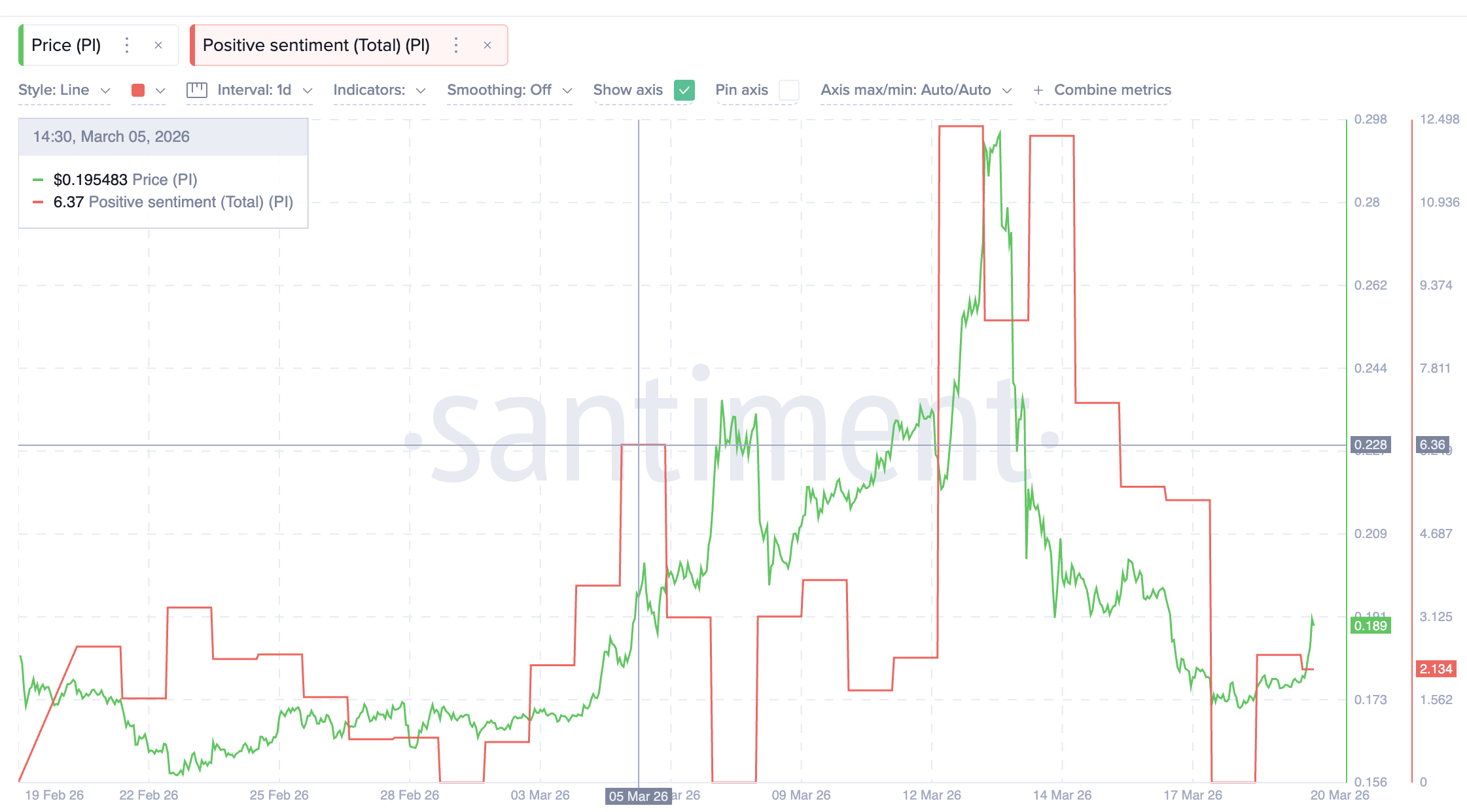 Historiallisesti PI:n paikallisia tunnelmahuippuja on seurannut hintaralli. 5. maaliskuuta, kun tunnelma saavutti 6,36, PI vaihtoi omistajaa noin 0,198 dollarin tasolla. 7. maaliskuuta mennessä hinta nousi noin 20 %. Nykyinen 2,13 lukema ei ole tarpeeksi vahva aiheuttamaan samanlaista palautusta.