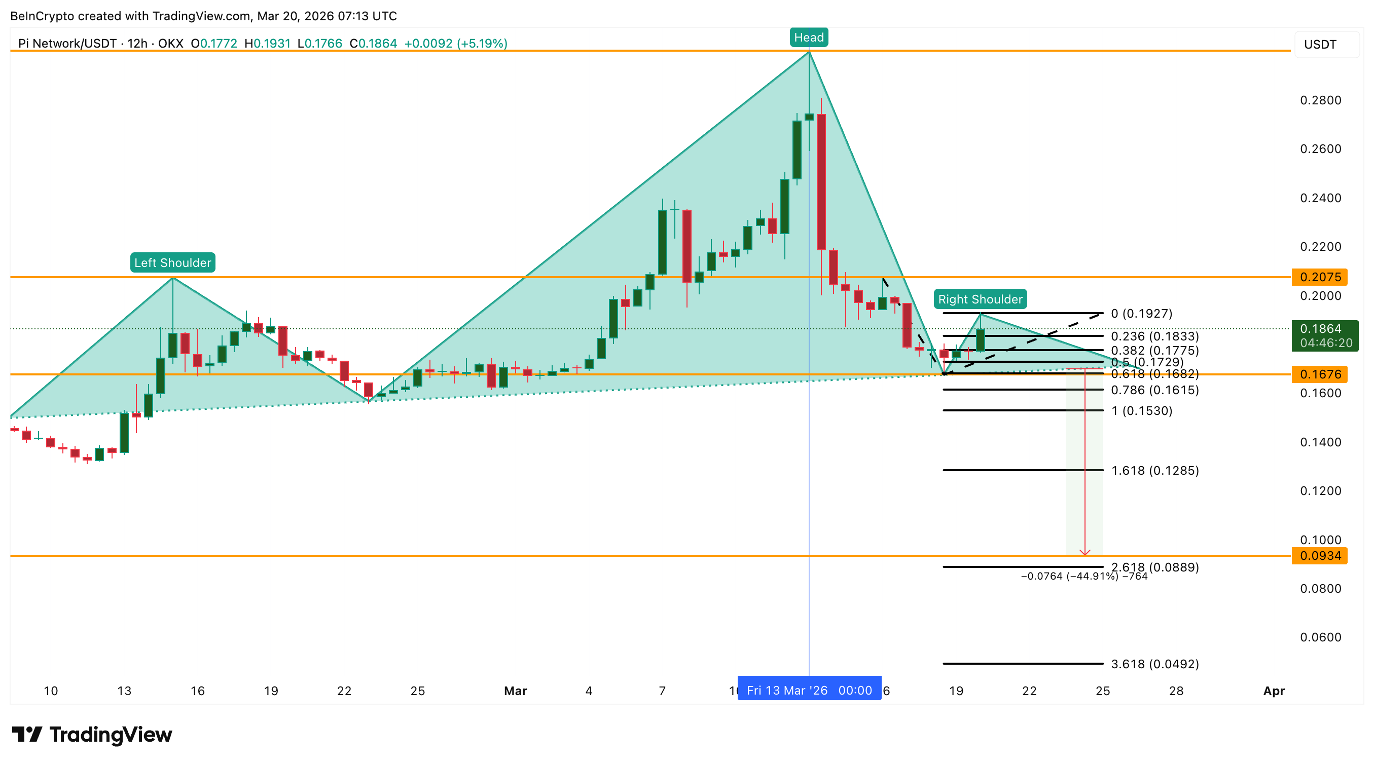 12 tunnin Pi Coin -hintakaavio osoittaa PI:n olevan oikean olkapään alueella, nousua noin 6 % päivässä. Keskeistä aluetta (nykyinen kaulanauha) 0,167–0,168 dollaria testattiin 18. maaliskuuta ja se piti, mutta palautus on edelleen jäänyt ilman merkittävää pääoman tukea.