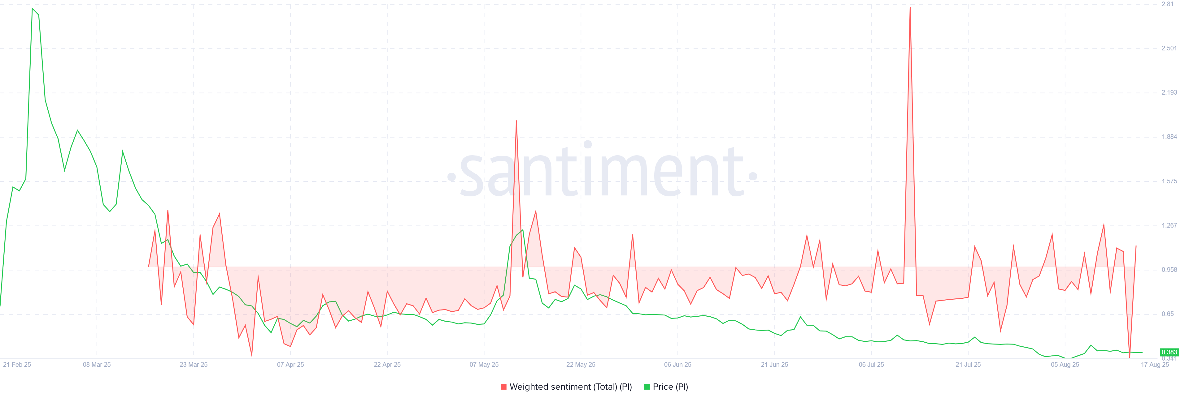 Sijoittajien tunnelma Pi Coinia kohtaan on laskenut jyrkästi, saavuttaen neljän kuukauden pohjan. Tämä lasku korostaa hiipuvaa innostusta, kun kauppiaat muuttuvat yhä varovaisemmiksi. Härkämarkkinoiden uskon puute viittaa siihen, että monet haltijat ovat epävarmoja Pi Coinin tulevaisuudesta.