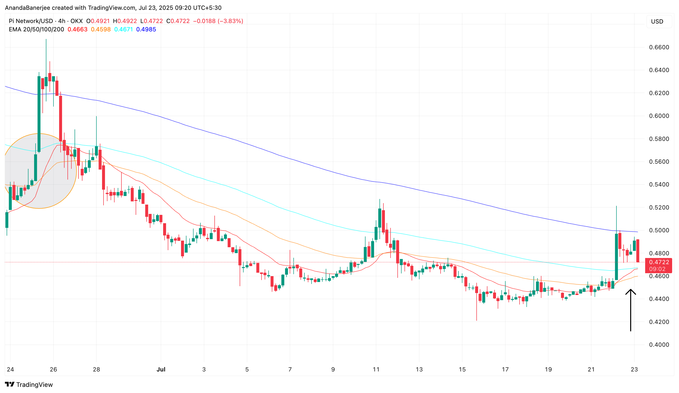 Sama tapahtui kesäkuun lopussa, kun hinta nousi noin 0,56 dollarista 0,66 dollariin. Tuolloin nopea EMA ei onnistunut ylittämään seuraavaa hitaampaa (100 jakson) EMA:ta, ja Pi Coinin hintaralli hiipui. Toinen risteäminen on nyt jälleen lähellä, melkein odottamassa tapahtumistaan.