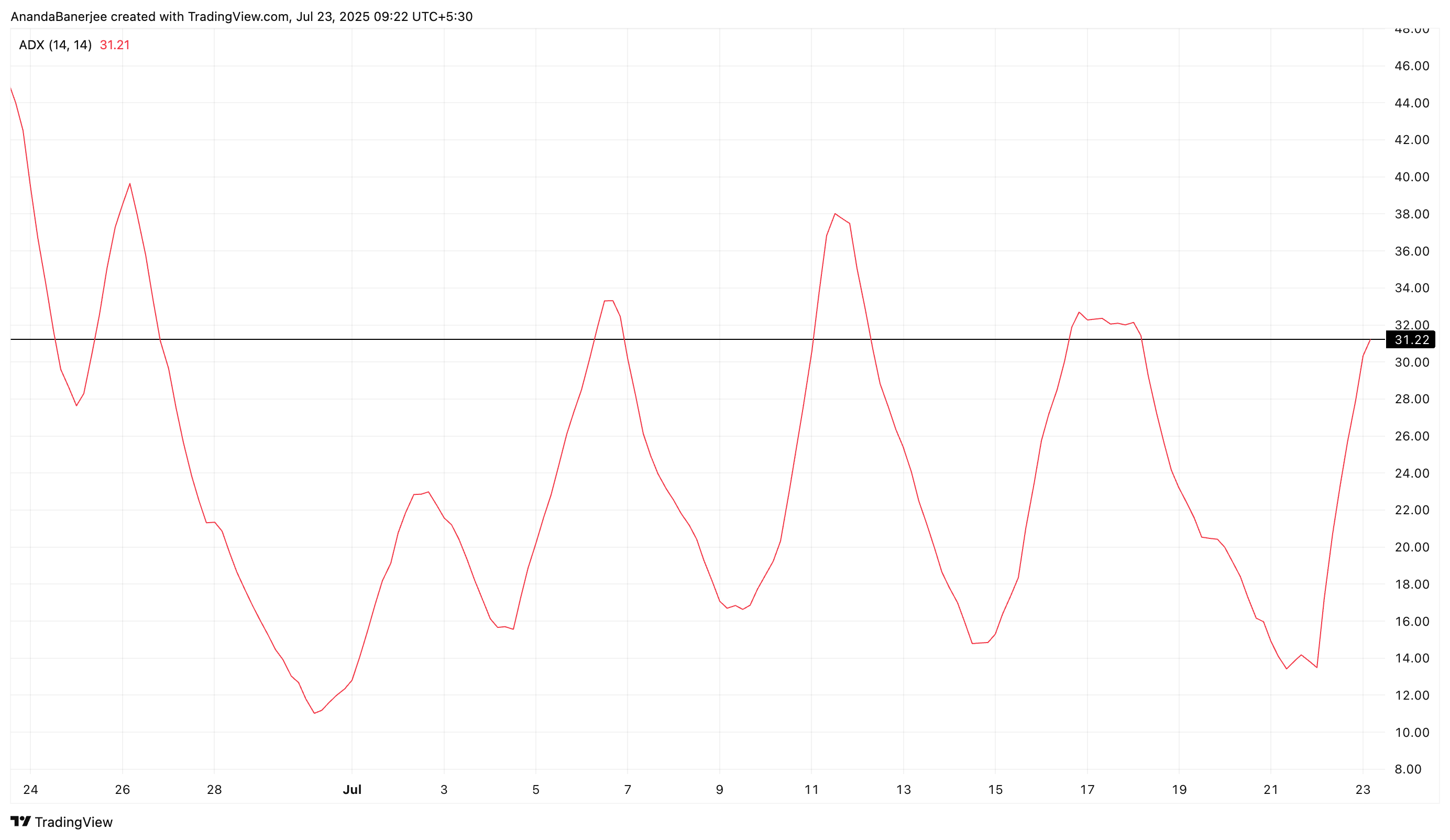 ADX mittaa, kuinka vahva trendi on (0–100). Se ei kerro ylös- tai alaspäin, joten se on luettava yhdessä hintatoiminnan kanssa.