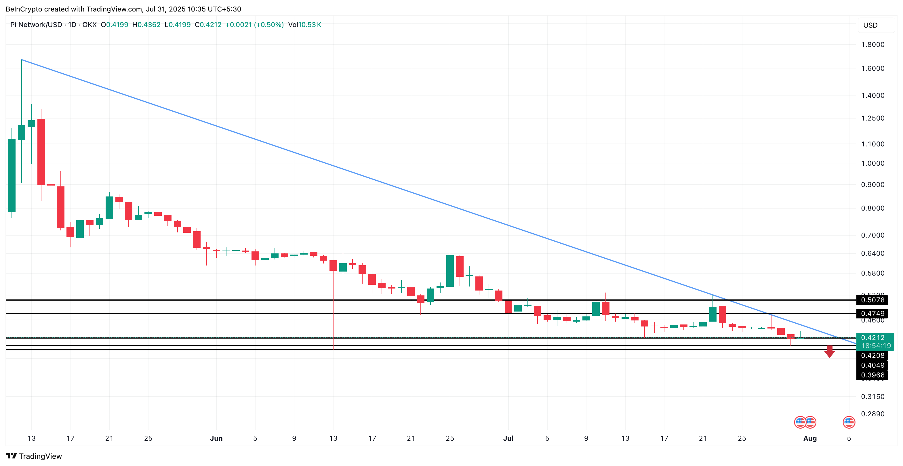 Kaaviossa Pi Coin on jumissa laskevassa kolmiossa, joka on laskeva kuvio, jossa alemmat huiput painavat heikkoa tukitasoa vastaan. Tällä hetkellä välitön tuki on 0,42 ja 0,40 dollarissa, joiden murtuminen näyttää yhä todennäköisemmältä, kun pääomaa ei juurikaan käytetä.