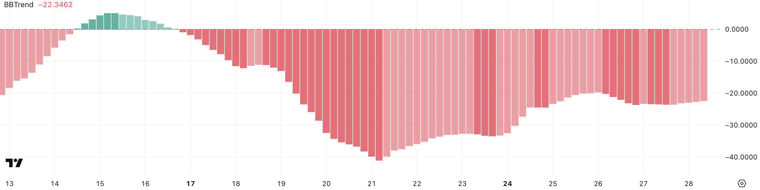 BBTrend saavutti äskettäin -41:n alarajan 21. maaliskuuta ja on pysynyt negatiivisena 16. maaliskuuta lähtien, mikä merkitsee kahdentoista peräkkäisen päivän karhumaisia trendisignaaleja. Tämä pitkäaikainen heikkous korostaa jatkuvaa kamppailua ostajien hallinnan palauttamiseksi markkinoilla.