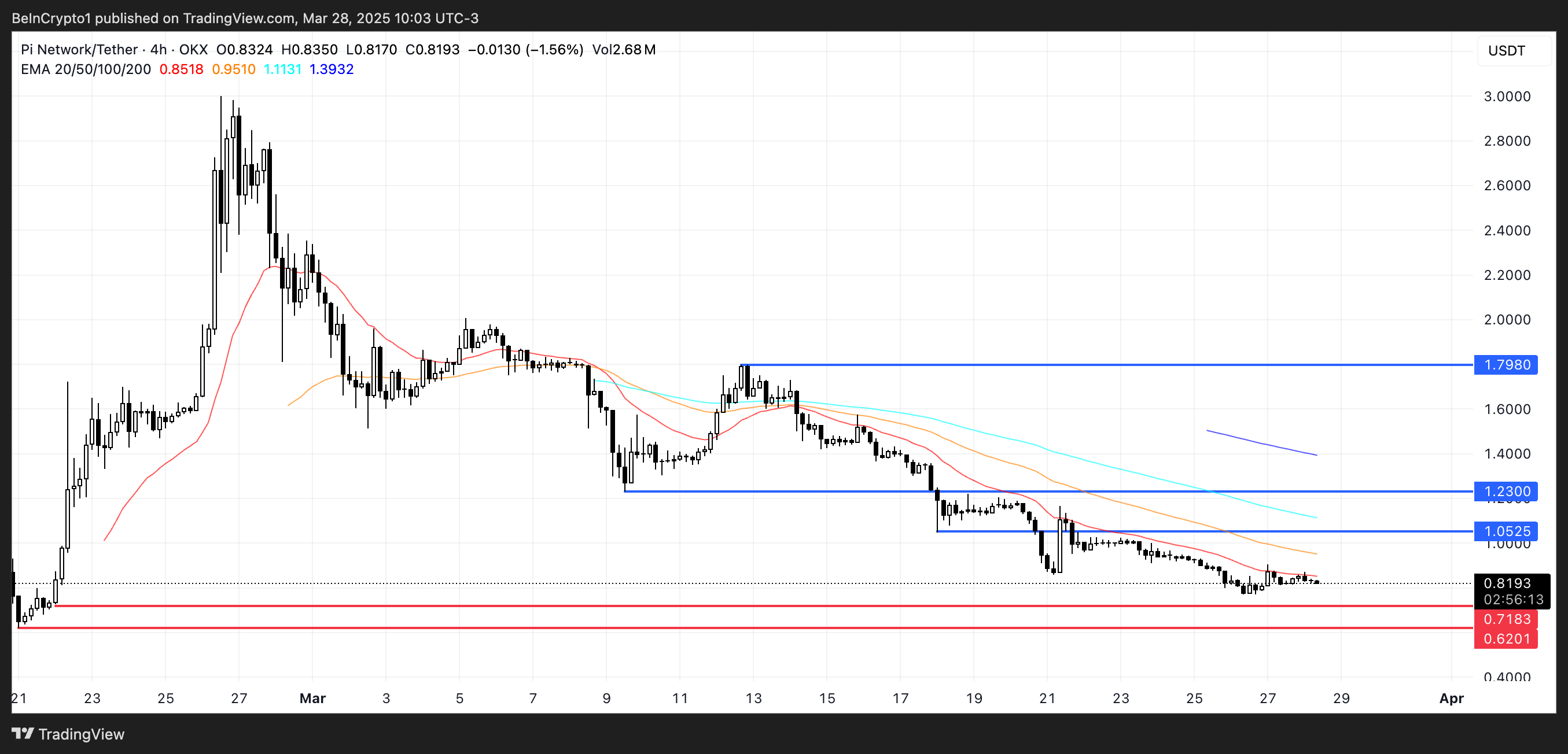 PI:n hinta liikkuu tällä hetkellä hyvin vakiintuneessa laskutrendissä, kuten sen EMA (Exponential Moving Average) -linjojen asettelu osoittaa—missä lyhyemmän aikavälin EMA:t pysyvät selvästi pidemmän aikavälin alapuolella.