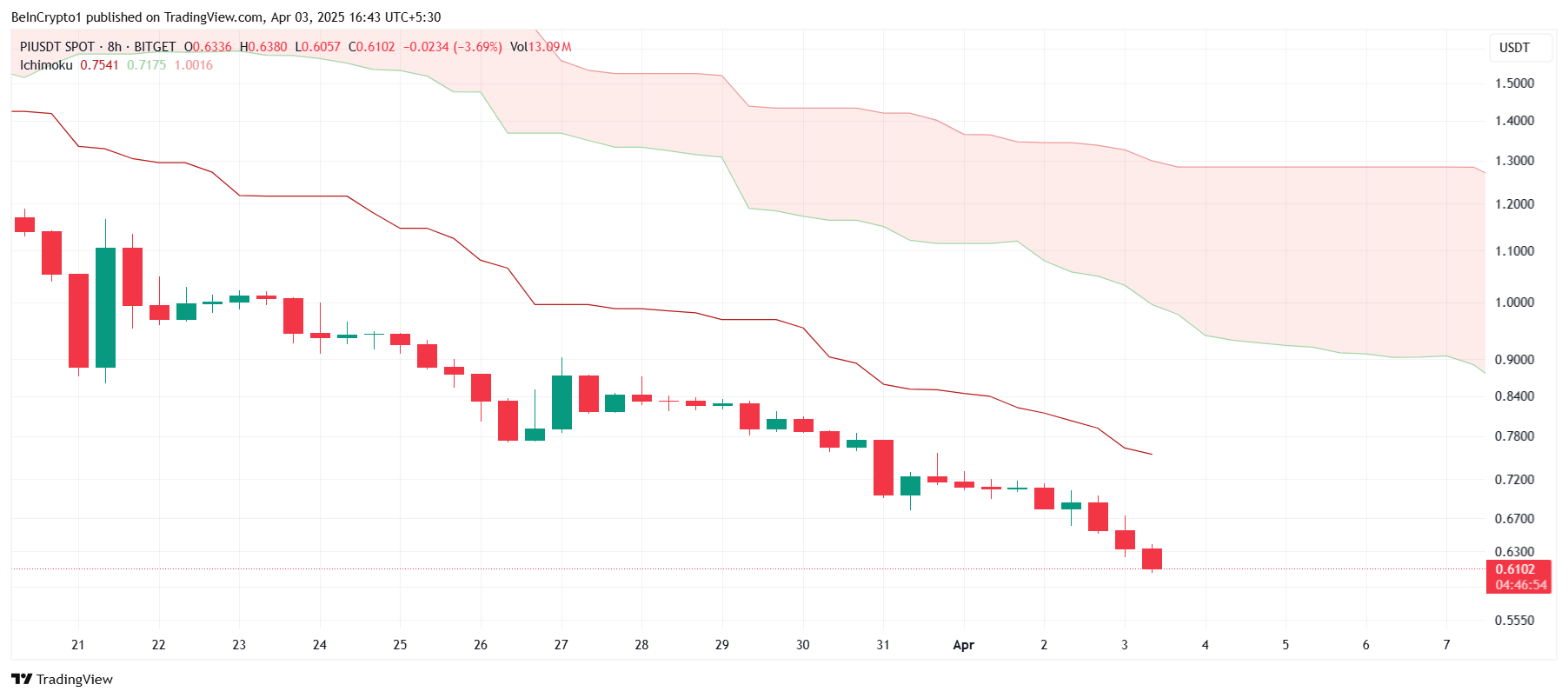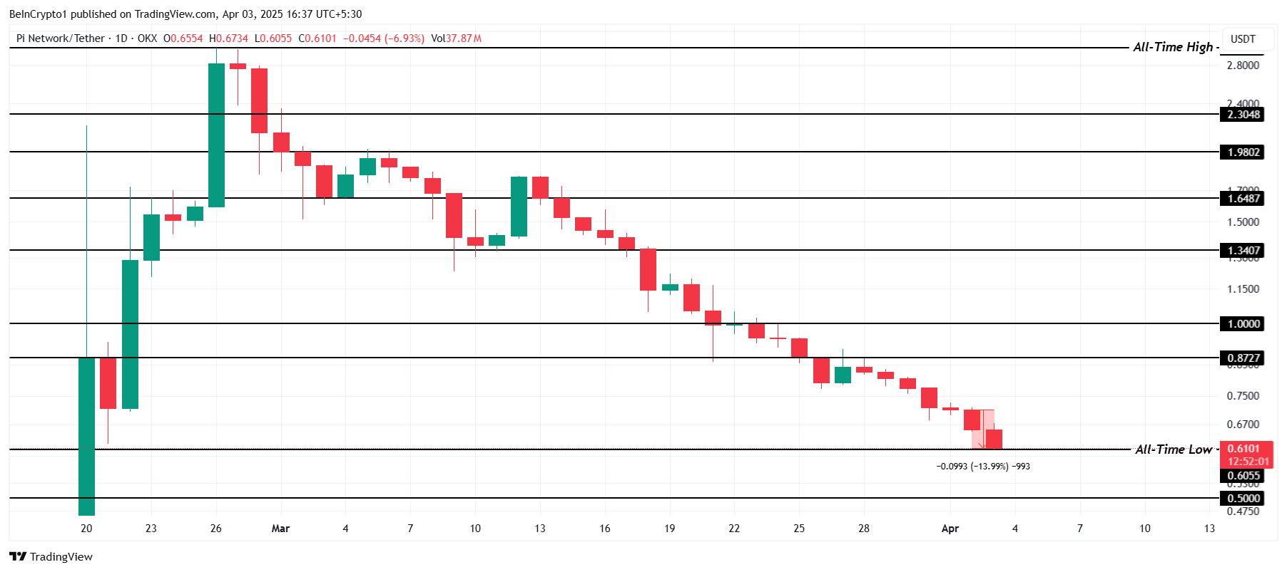 Pi Networkin hinta on tällä hetkellä 0,61 dollaria, ja se on muodostanut uuden kaikkien aikojen alhaisimman hinnan 0,60 dollaria pudottuaan lähes 14 % viimeisen 24 tunnin aikana. Altcoin jatkaa kamppailuaan negatiivisen tunnelman alla eikä osoita merkkejä käänteestä lähitulevaisuudessa.
