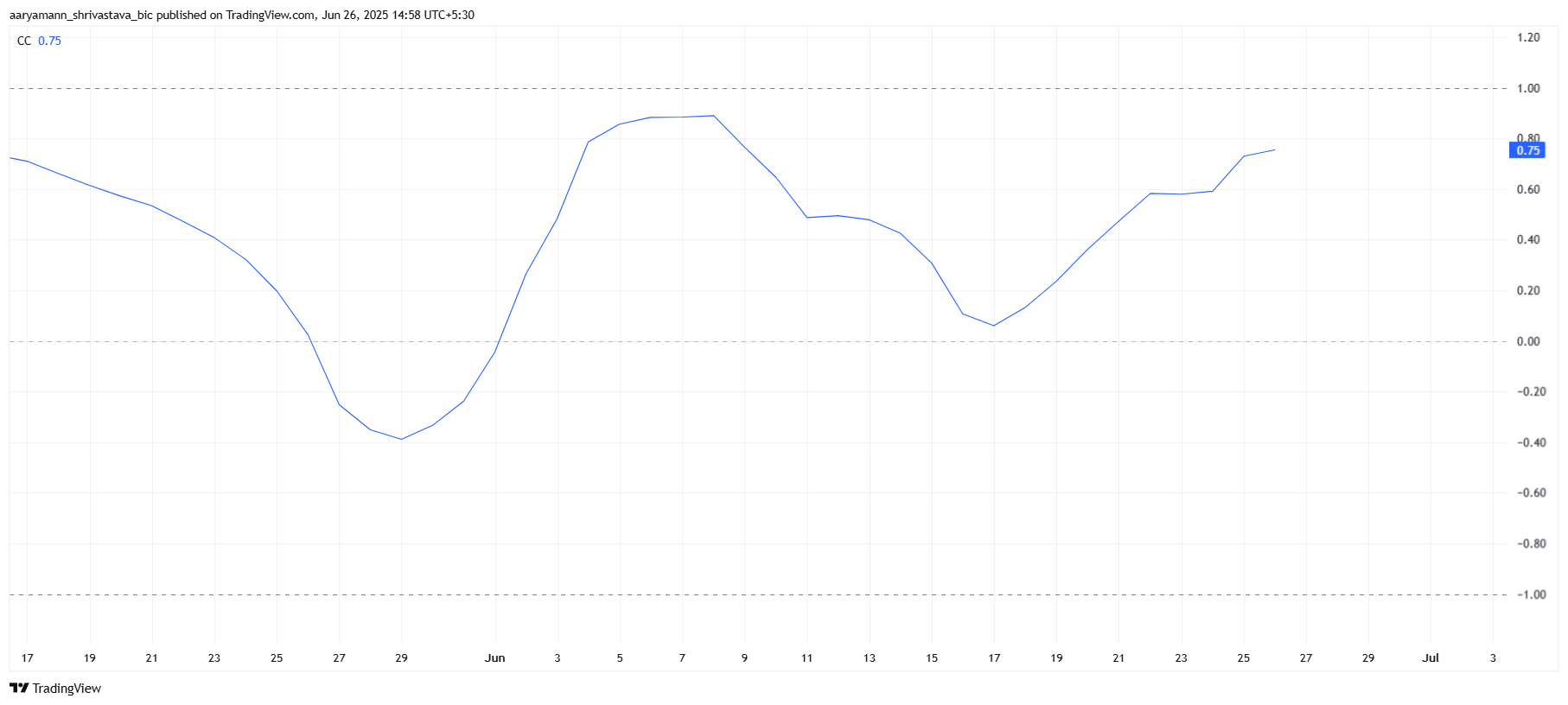 Pi Networkin korrelaatio Bitcoinin kanssa on vahva, korrelaatiokertoimen ollessa 0,71, mikä viittaa siihen, että Pi todennäköisesti hyötyy BTC:n nousujohteisesta tunnelmasta. Bitcoin lähestyy 108 000 dollarin hintapistettä, ja tämä BTC:n arvon nousu voi vaikuttaa positiivisesti Pin hintaan.
