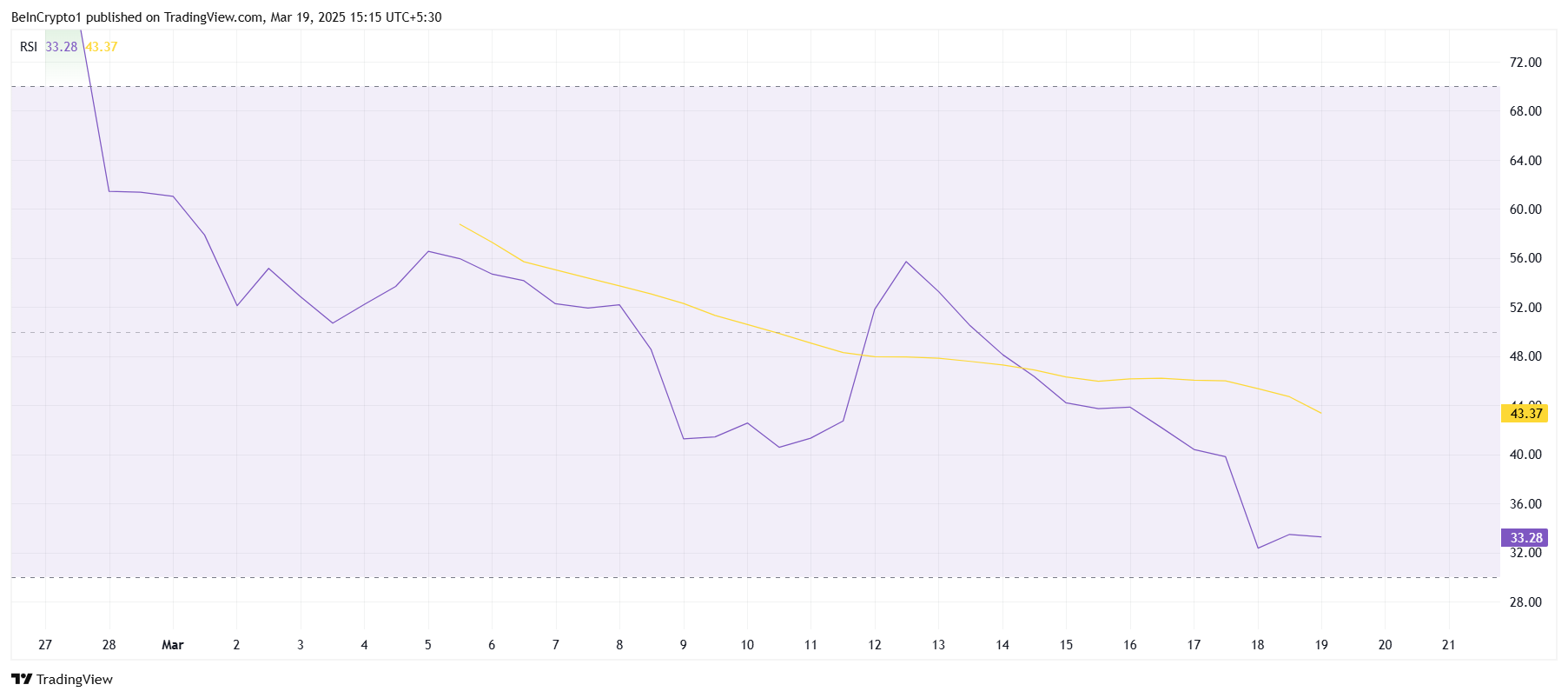 Koko markkinoiden tunnelma heijastaa edelleen karhumaisia olosuhteita, ja Relative Strength Index (RSI) lähestyy ylimyytyä kynnysarvoa 30,0. Tämä viittaa siihen, että Pi Network, yhdessä muiden altcoinien kanssa, kohtaa merkittävää myyntipainetta. Yleinen markkinatrendi painaa useimpia kryptovaluuttoja alaspäin, ja PI ei näytä olevan poikkeus.