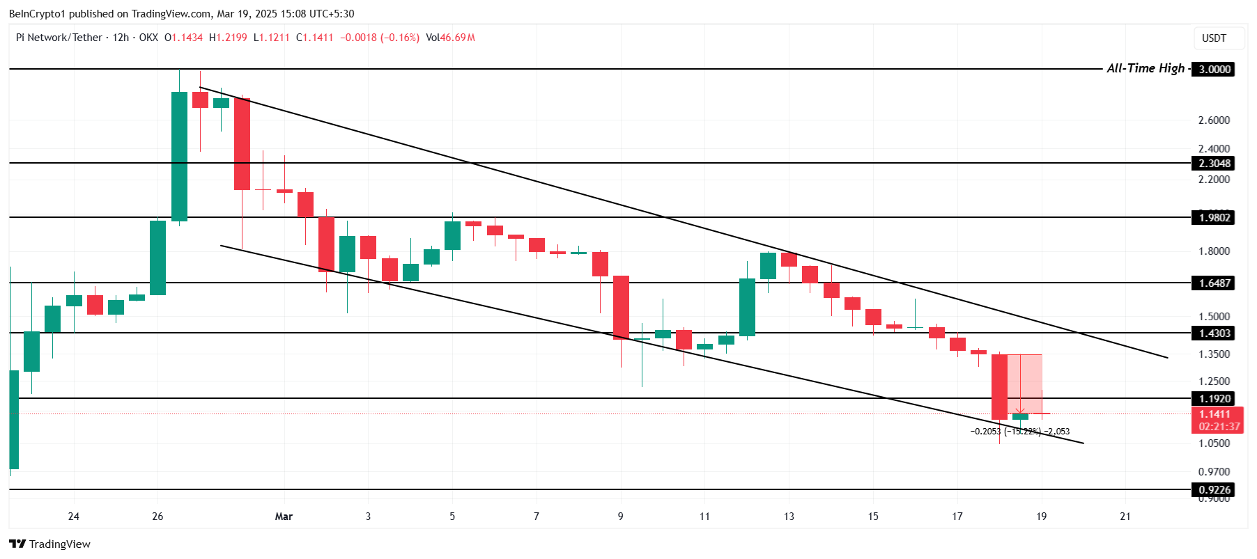 Jos nämä karhumaiset olosuhteet jatkuvat, PI todennäköisesti putoaa trendilinjan läpi ja saavuttaa tukitason 0,92 dollaria. Tämä toisi PI:n lähemmäksi kriittistä 1,00 dollarin tasoa, mikä voisi laukaista lisää myyntejä sijoittajilta, kun laskusuuntaus voimistuu. Putoaminen alle 1,00 dollarin olisi huolestuttavaa, sillä se merkitsisi merkittävää tappiota haltijoille.