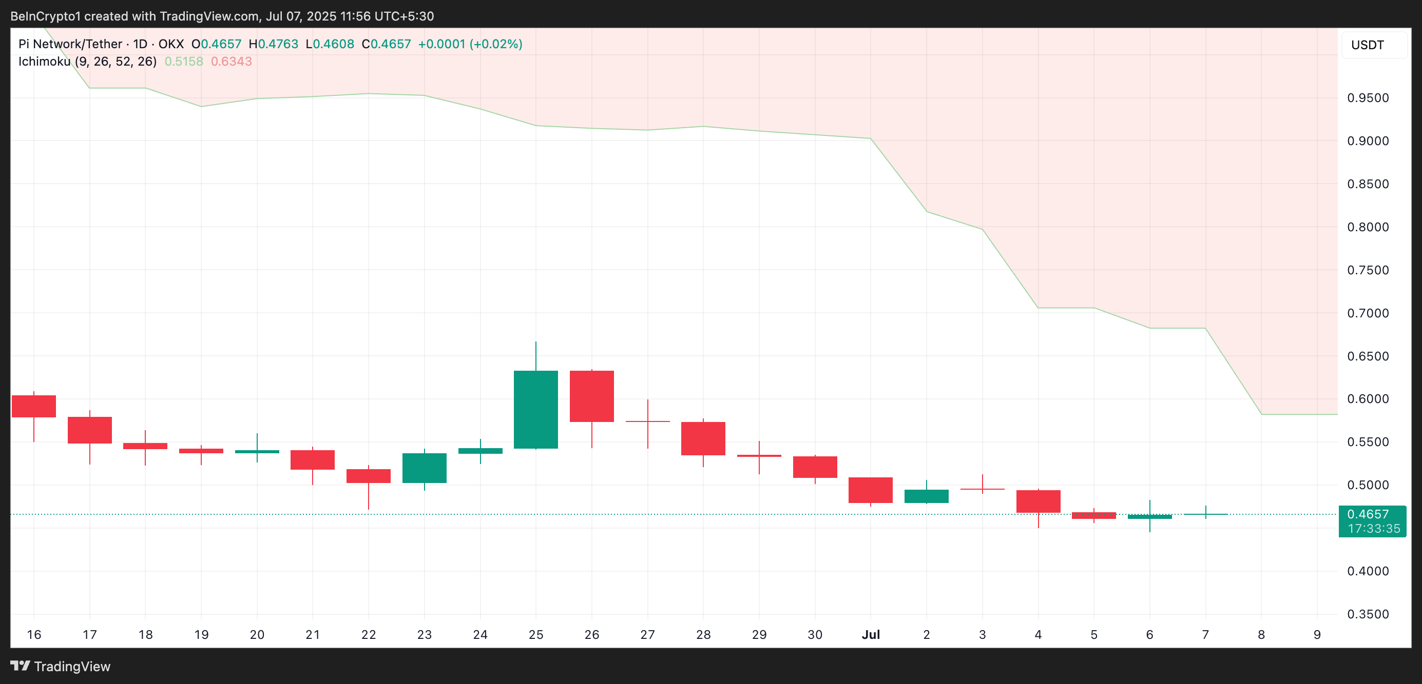 PI/USD-yhden päivän kaavion lukemat paljastavat, että altcoinin sulkeuduttua 0,46 dollariin 4. heinäkuuta, se on epäonnistunut ylittämään tämän hintatason. Tämä entinen tukitaso on nyt muuttunut vastusalueeksi, jota PI näyttää kamppailevan ylittääkseen, kun kysyntä heikkenee.